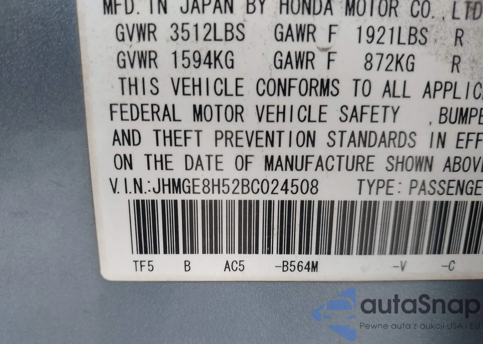 VIN: JHMGE8H52BC024508