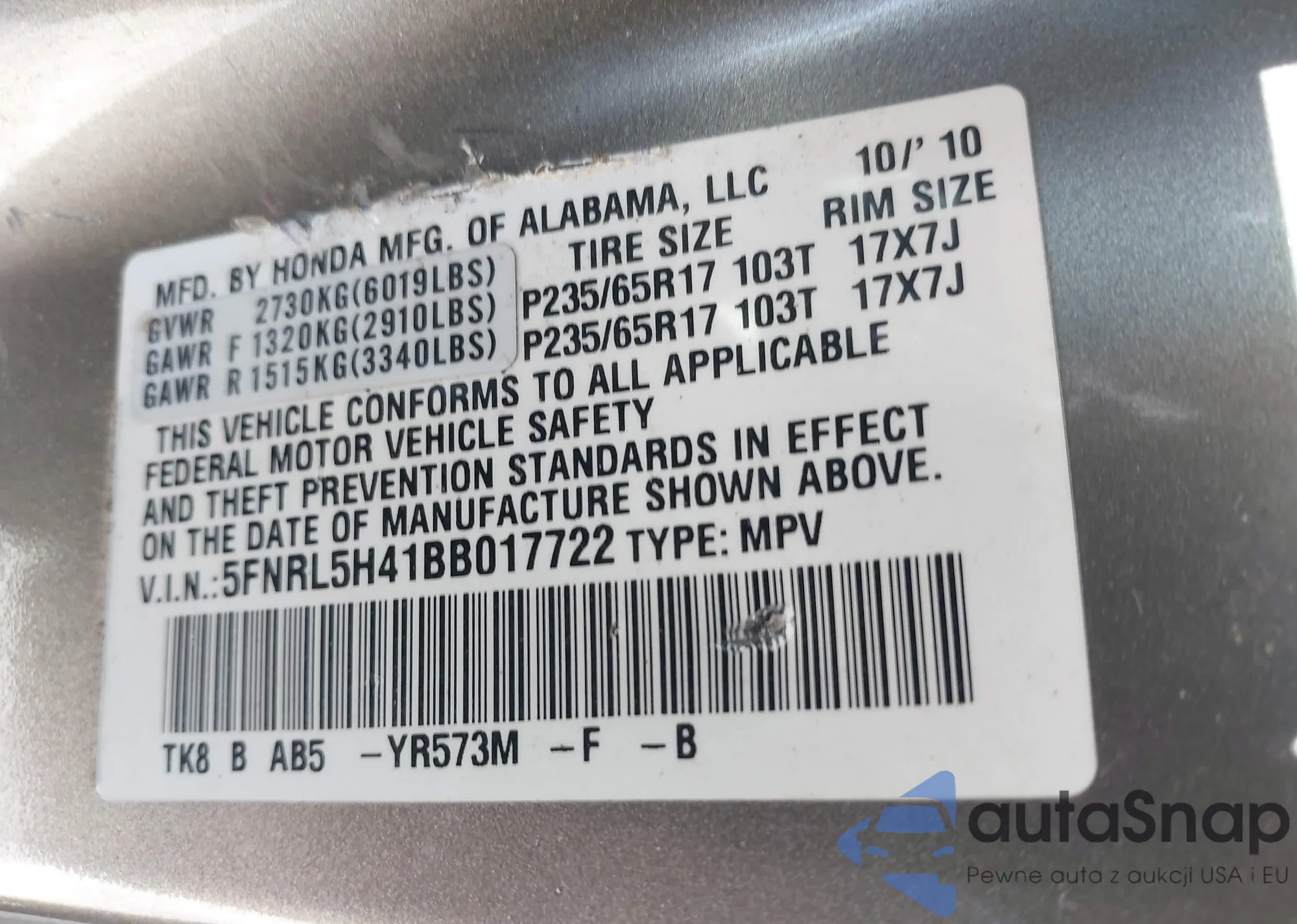 VIN: 5FNRL5H41BB017722