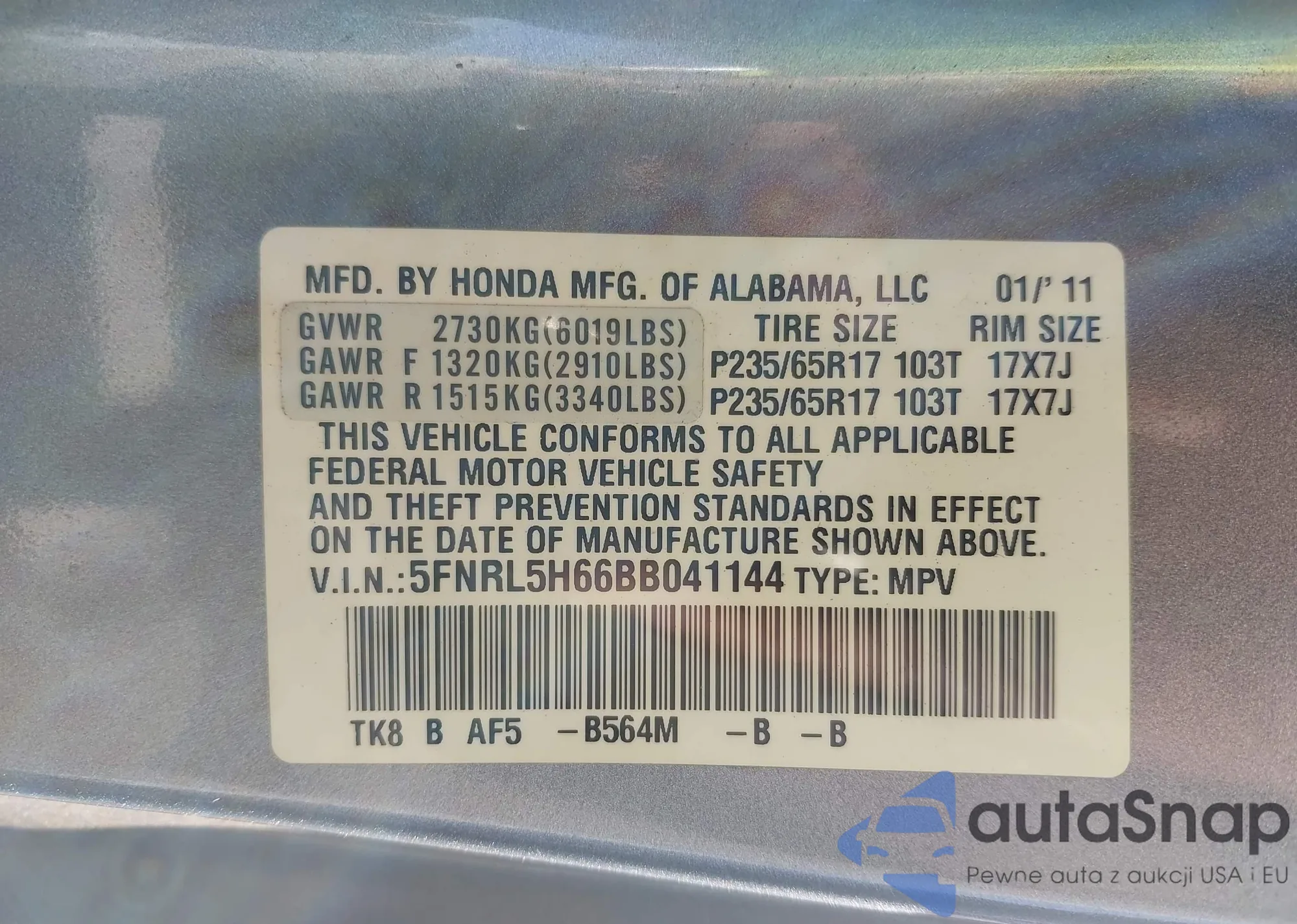 VIN: 5FNRL5H66BB041144