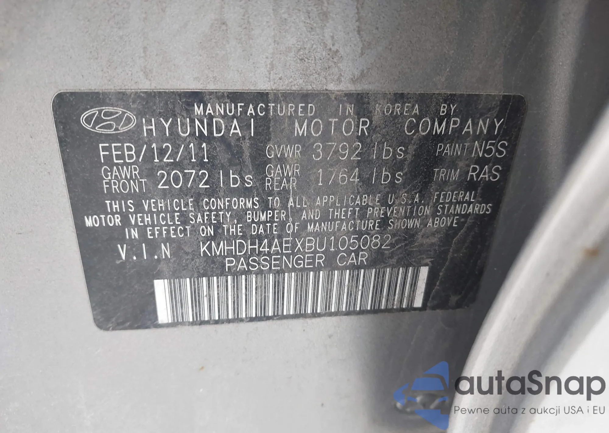 Samochód Hyundai Elantra 2011 (VIN KMHDH4AEXBU105082) nie był wcześniej licytowany. Dokumenty są czyste, przebieg odpowiada lub jest niższy niż średnia rynku. Sprzedaje go firma ubezpieczeniowa – polecamy zakup. Dostawa do portu zajmie ok. 6–8 tygodni.