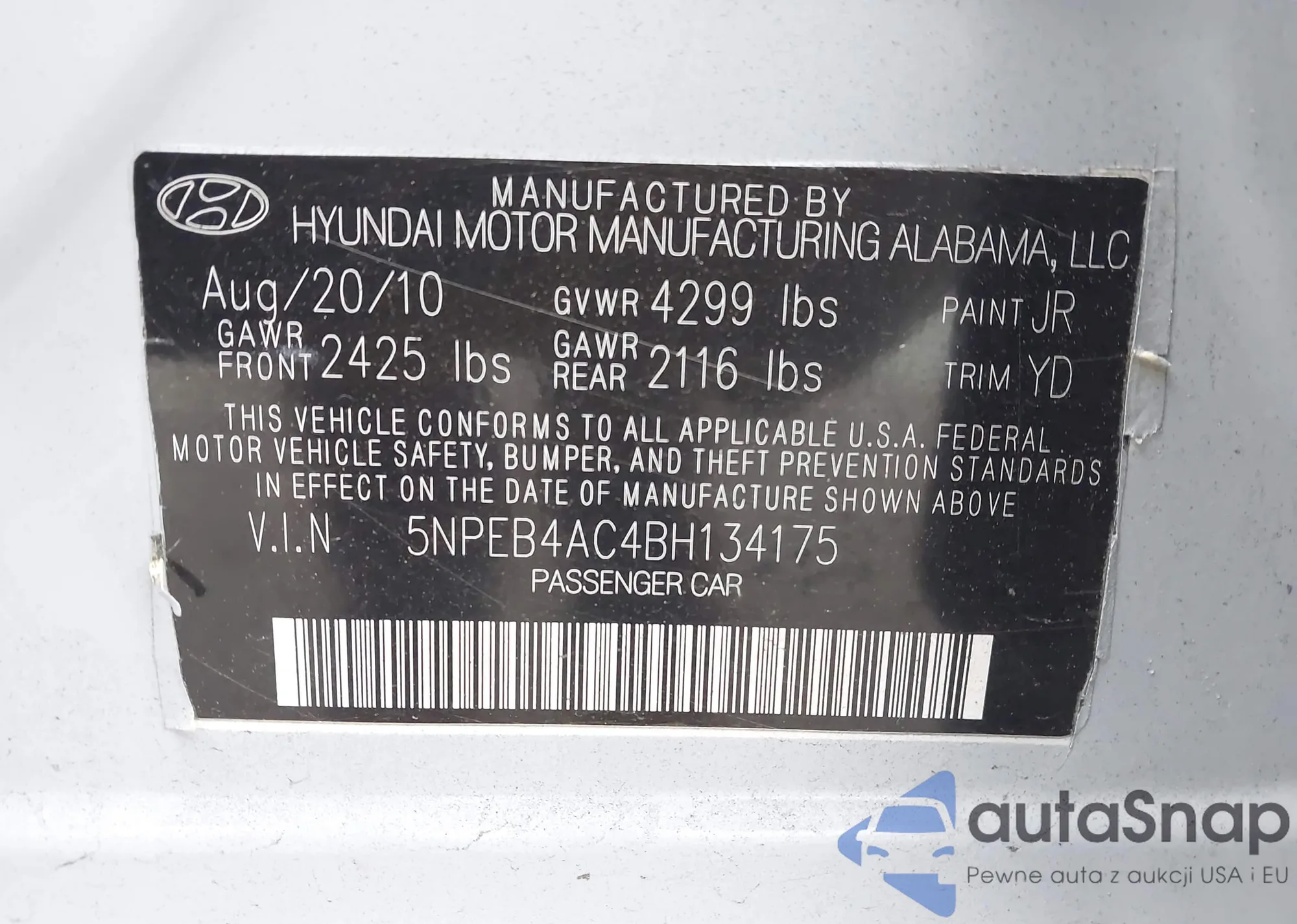 Samochód Hyundai Sonata 2011 (VIN 5NPEB4AC4BH134175) nie był wcześniej licytowany. Dokumenty są czyste, przebieg odpowiada lub jest niższy niż średnia rynku. Sprzedaje go firma ubezpieczeniowa – polecamy zakup. Dostawa do portu zajmie ok. 6–8 tygodni.