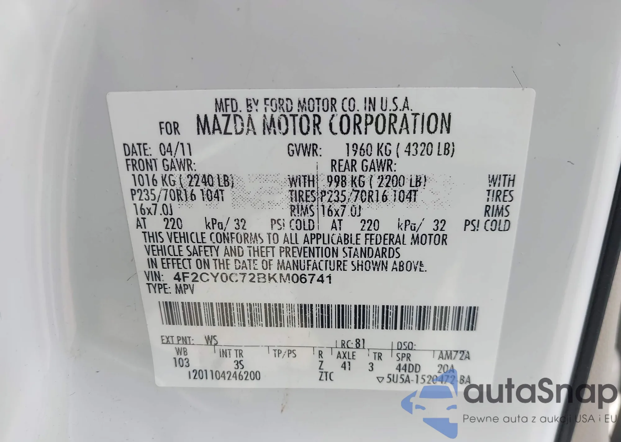 • VIN: 4F2CY0C72BKM06741