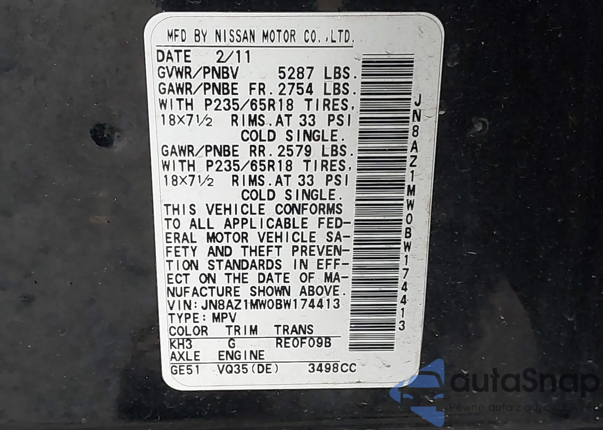 VIN: JN8AZ1MW0BW174413