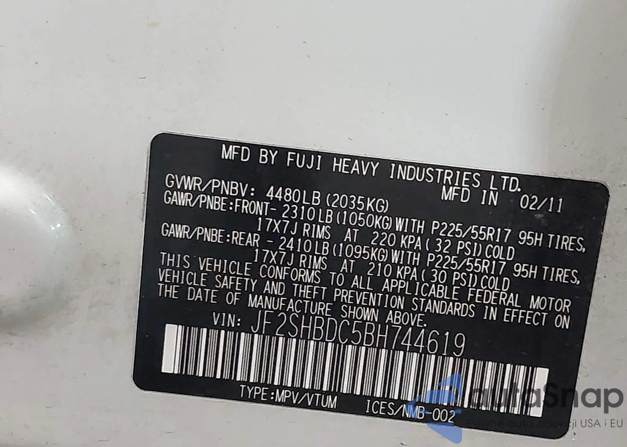 • VIN: JF2SHBDC5BH744619