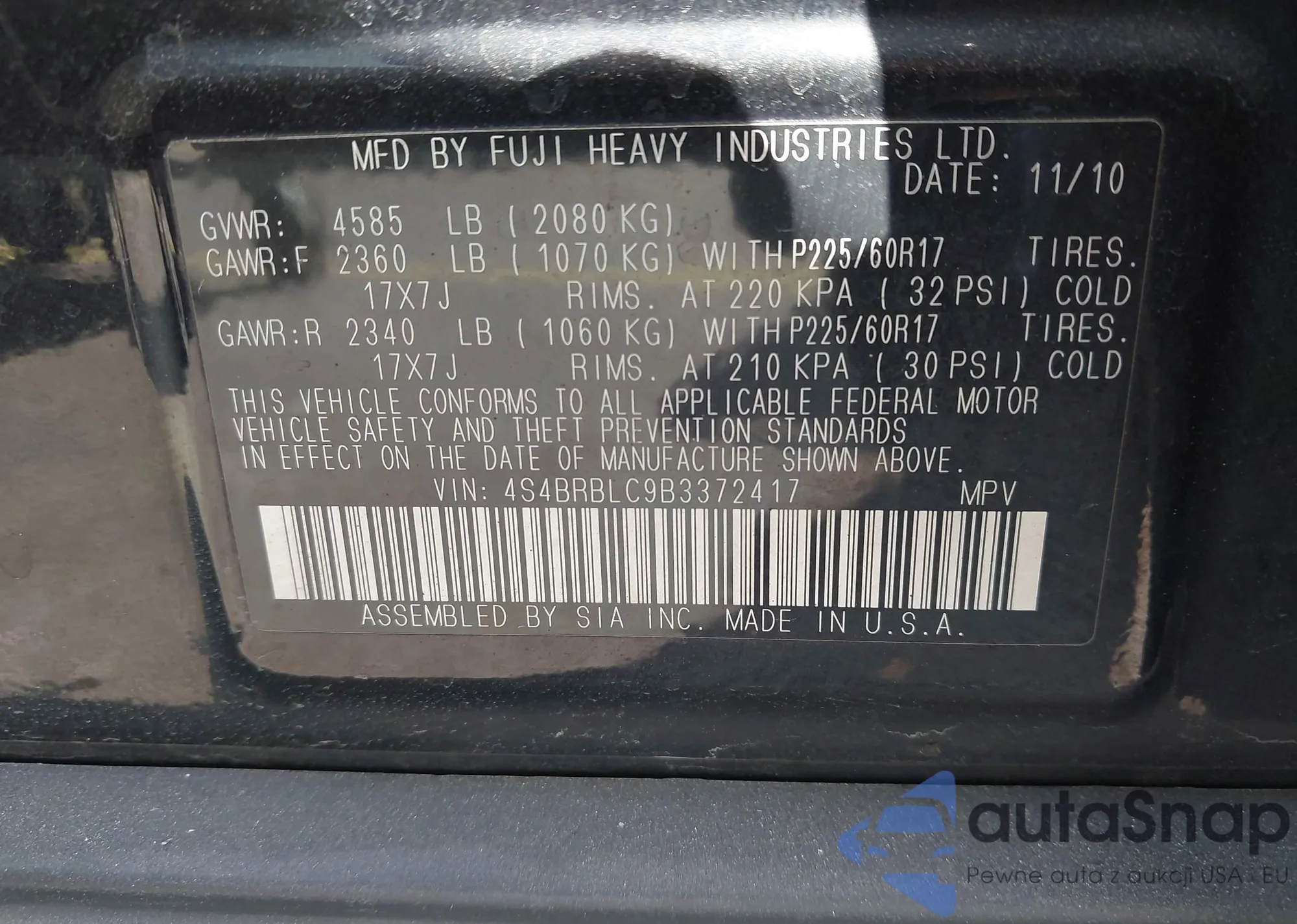 Samochód Subaru Outback 2011 (VIN 4S4BRBLC9B3372417) sprzedaje go niezweryfikowany sprzedawca. Zalecamy raport Carfax i potwierdzenie możliwości rejestracji pojazdu przed zakupem.