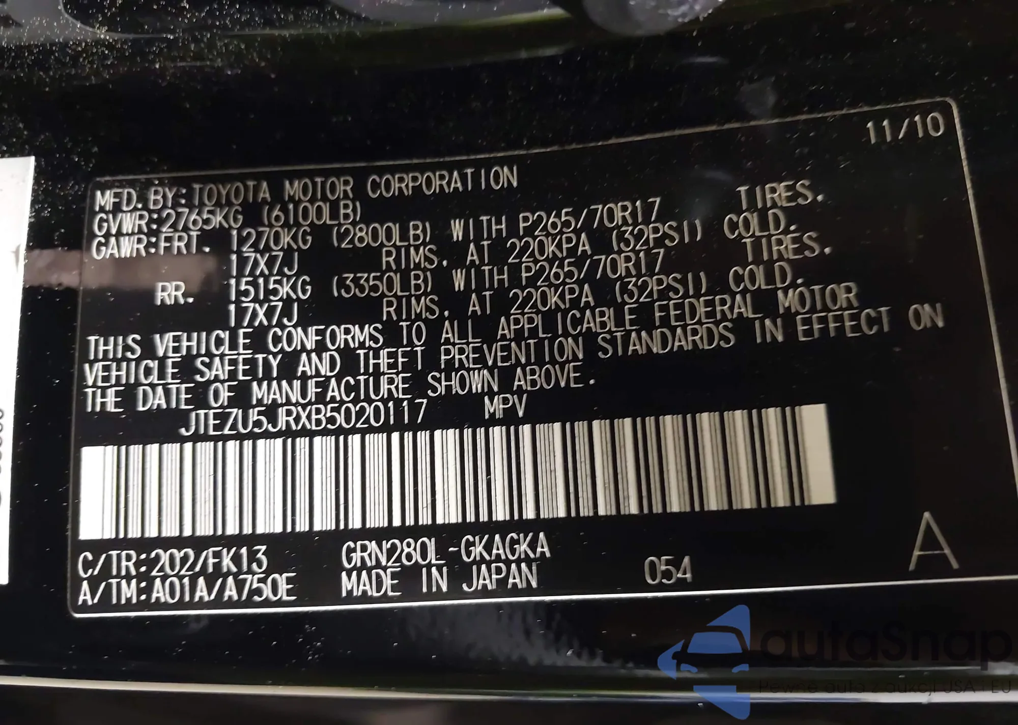 Samochód Toyota 4Runner 2011 (VIN JTEZU5JRXB5020117) nie był wcześniej licytowany. Dokumenty są czyste, przebieg odpowiada lub jest niższy niż średnia rynku. Sprzedaje go firma ubezpieczeniowa – polecamy zakup. Dostawa do portu zajmie ok. 6–8 tygodni.