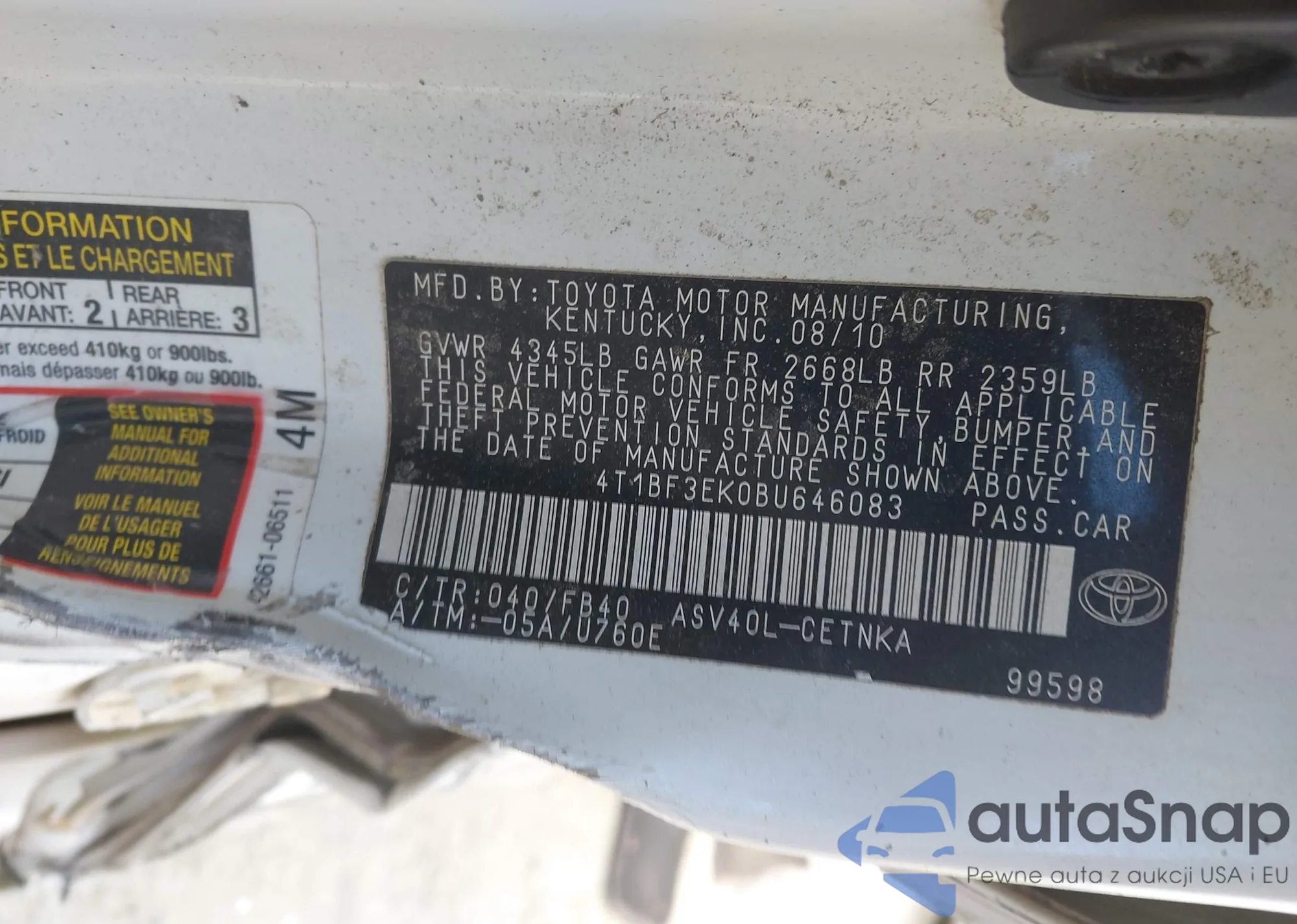 • VIN: 4T1BF3EK0BU646083