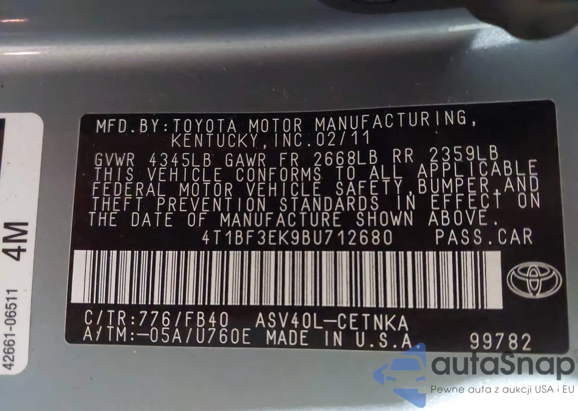 • VIN: 4T1BF3EK9BU712680