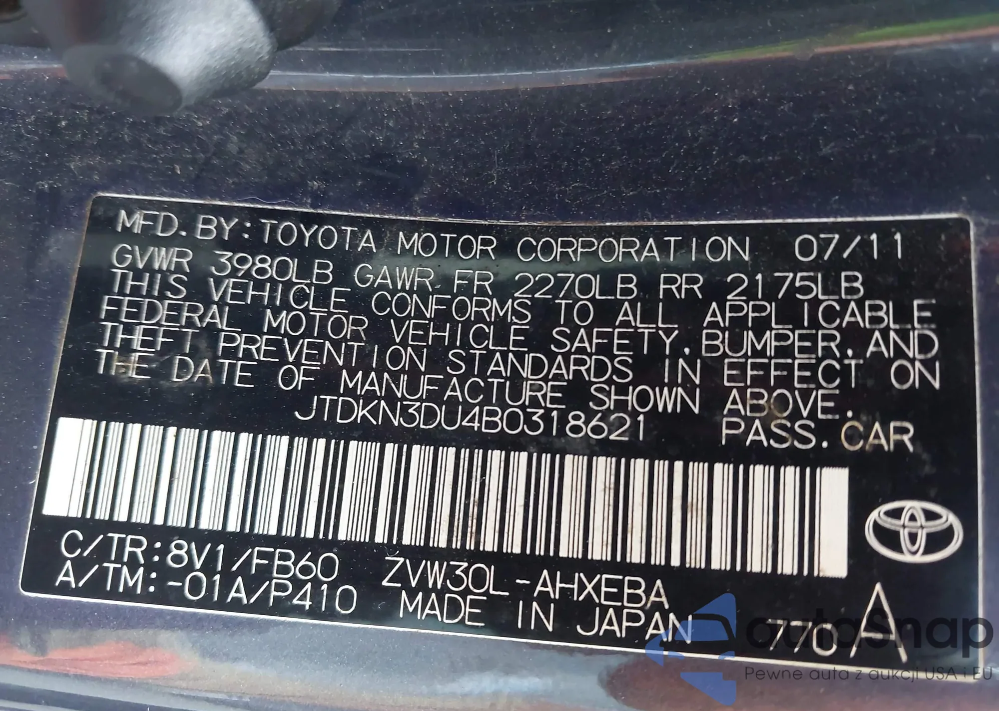 Samochód Toyota Prius 2011 (VIN JTDKN3DU4B0318621) nie był wcześniej licytowany. Dokumenty są czyste, przebieg odpowiada lub jest niższy niż średnia rynku. Sprzedaje go firma ubezpieczeniowa – polecamy zakup. Dostawa do portu zajmie ok. 6–8 tygodni.