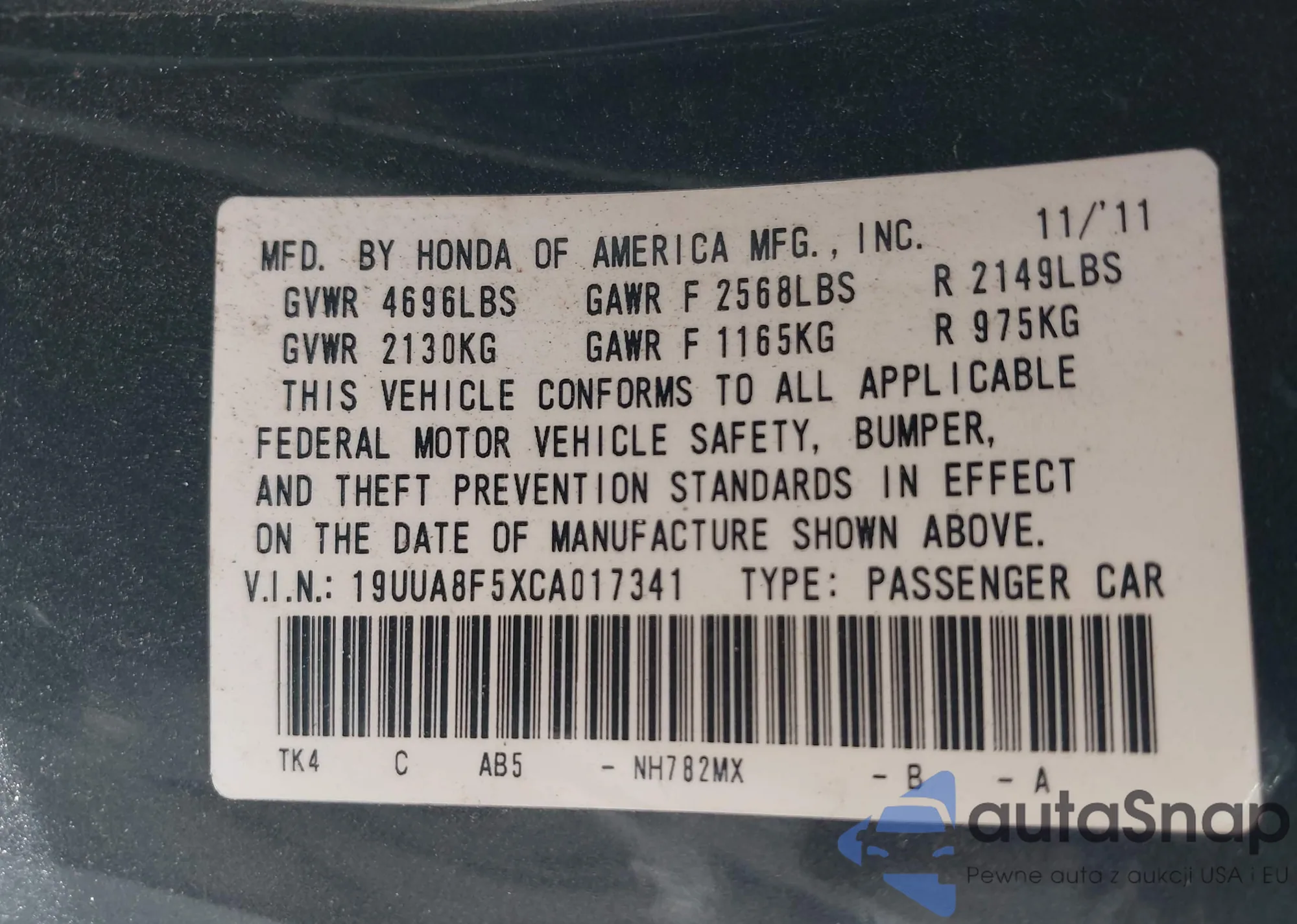 • VIN: 19UUA8F5XCA017341