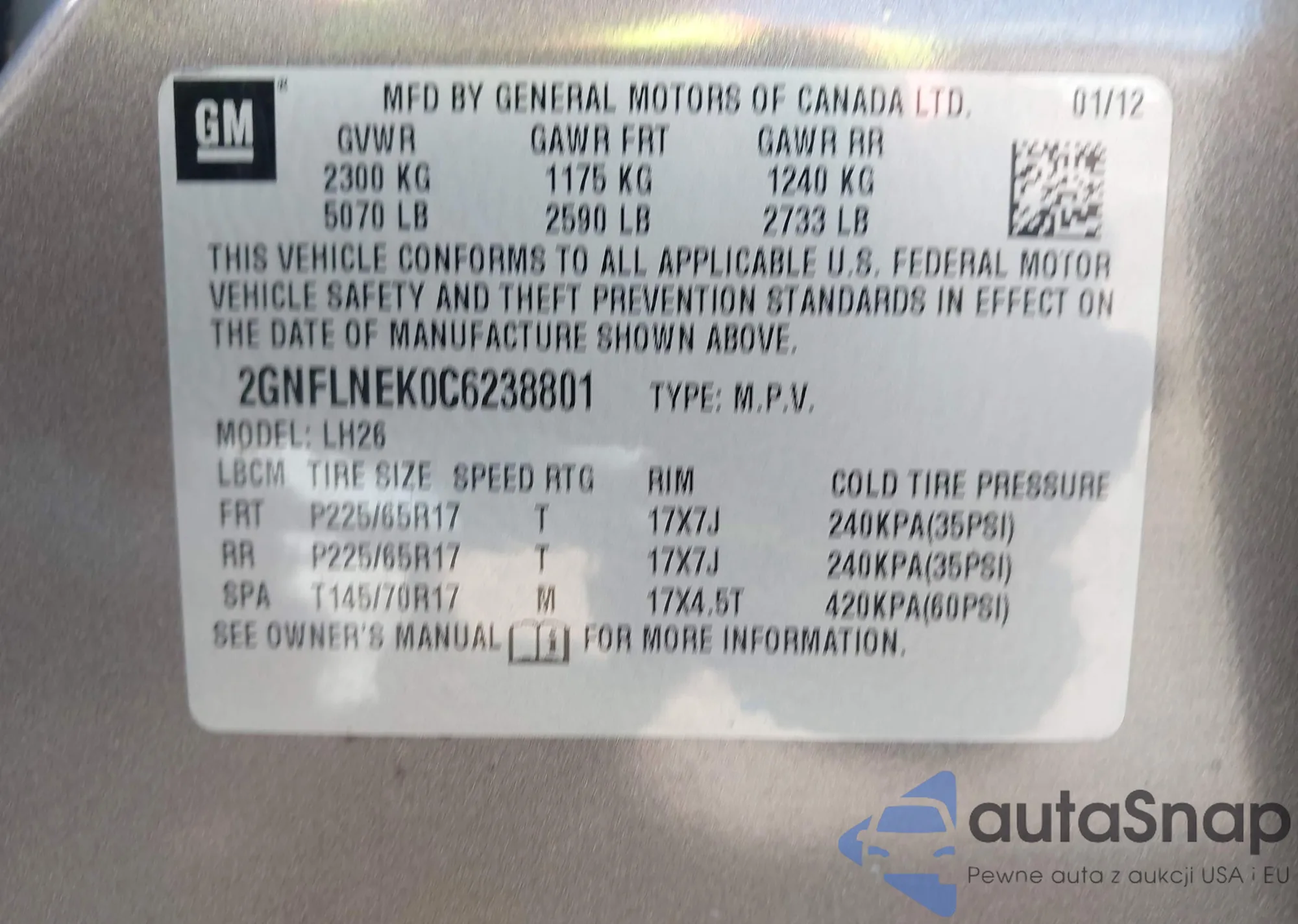 VIN: 2GNFLNEK0C6238801