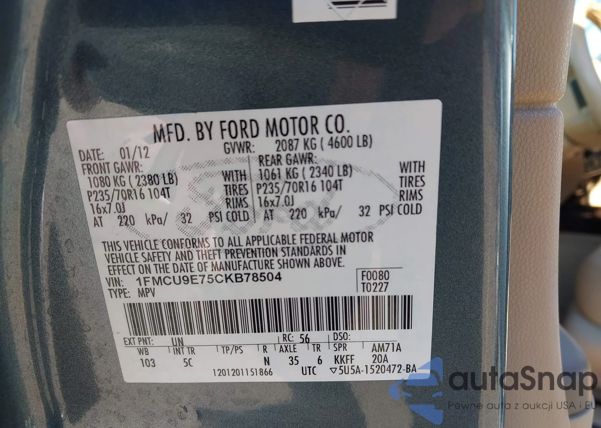 Samochód Ford Escape 2012 (VIN 1FMCU9E75CKB78504) nie był wcześniej licytowany. Dokumenty są czyste, przebieg odpowiada lub jest niższy niż średnia rynku. Sprzedaje go firma ubezpieczeniowa – polecamy zakup. Dostawa do portu zajmie ok. 6–8 tygodni.