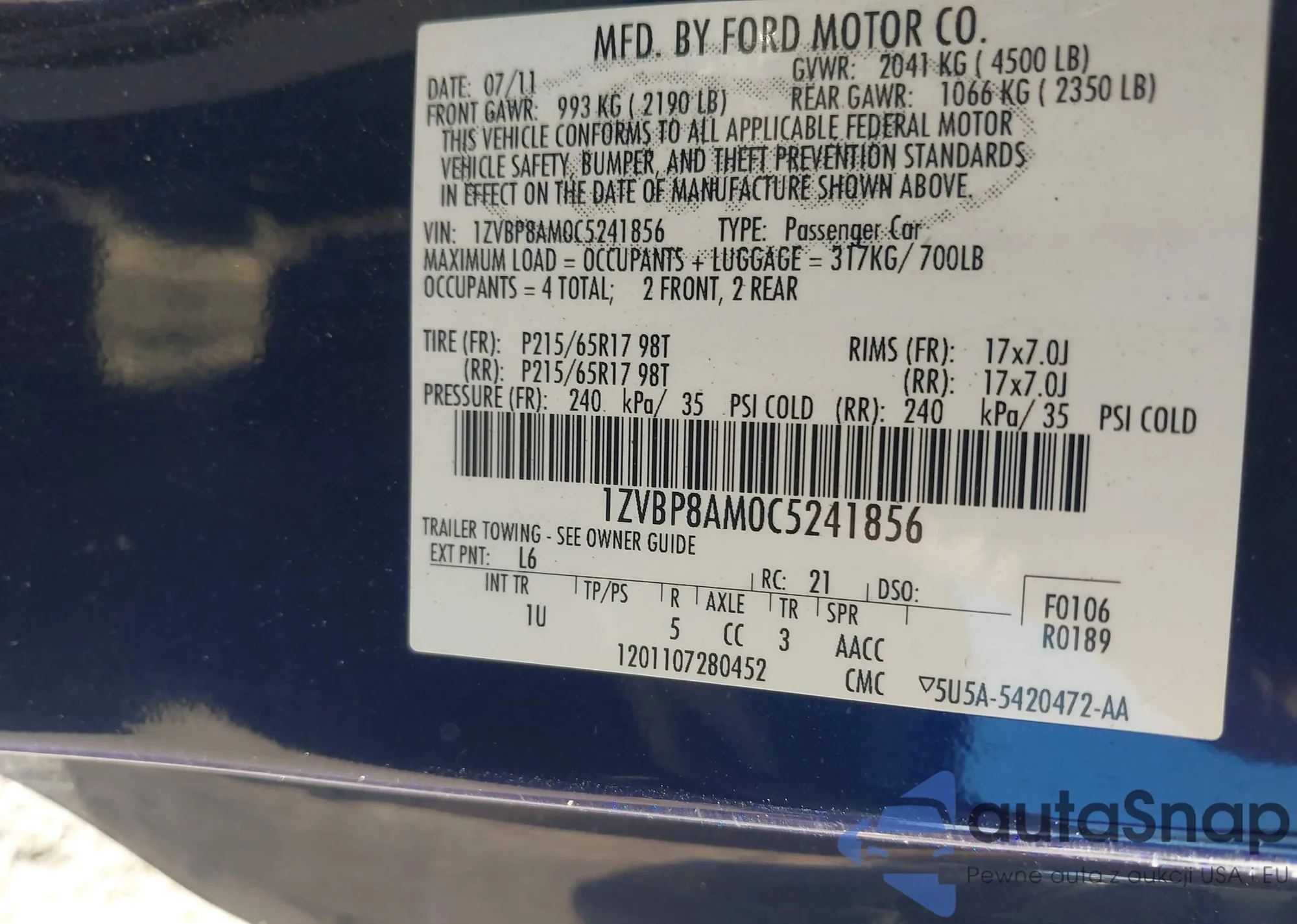 • VIN: 1ZVBP8AM0C5241856
