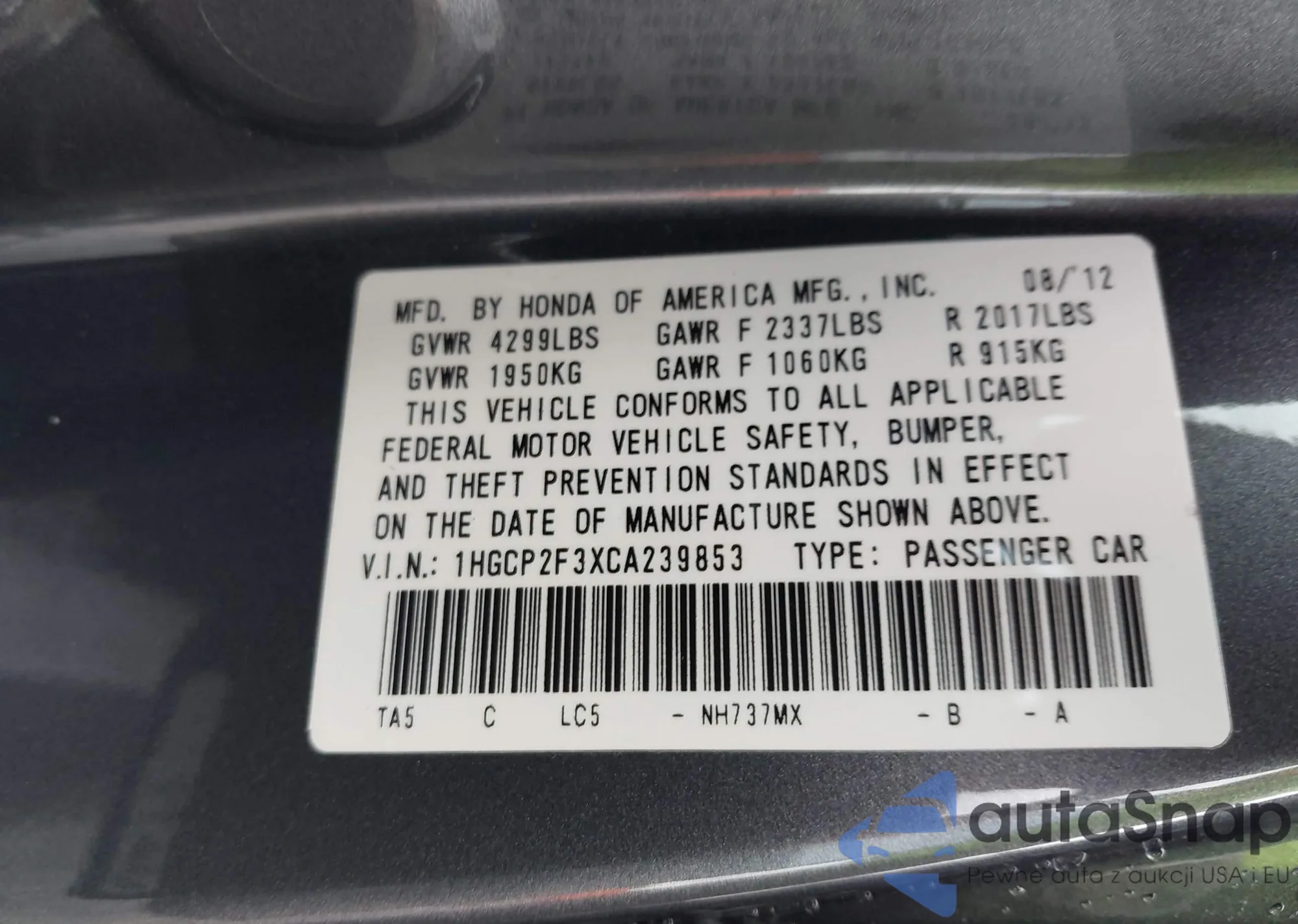 VIN: 1HGCP2F3XCA239853