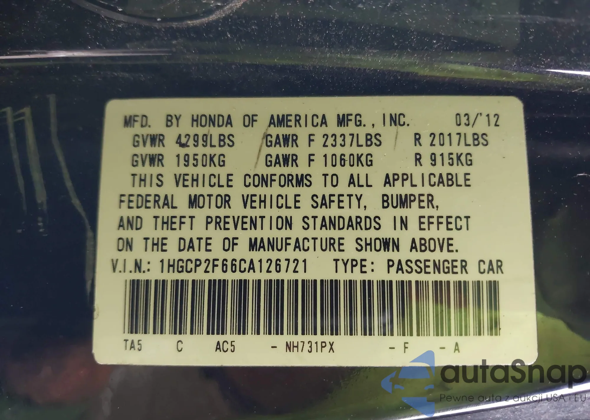 • VIN: 1HGCP2F66CA126721
