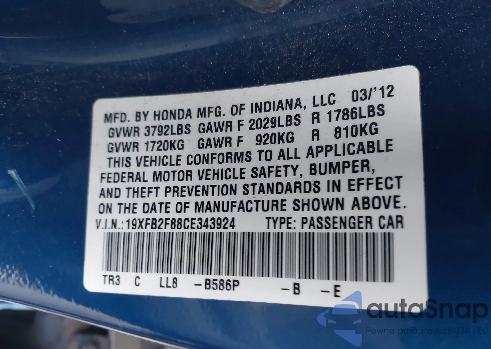 • VIN: 19XFB2F88CE343924