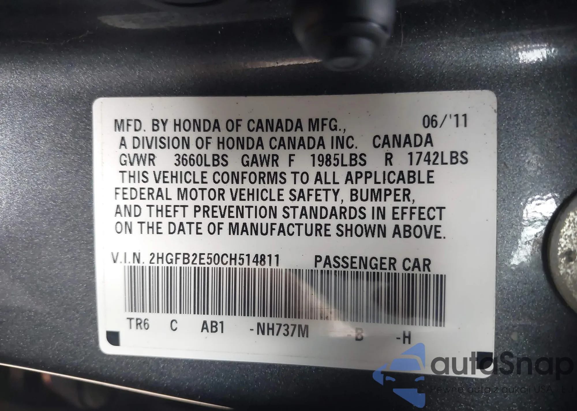 • VIN: 2HGFB2E50CH514811