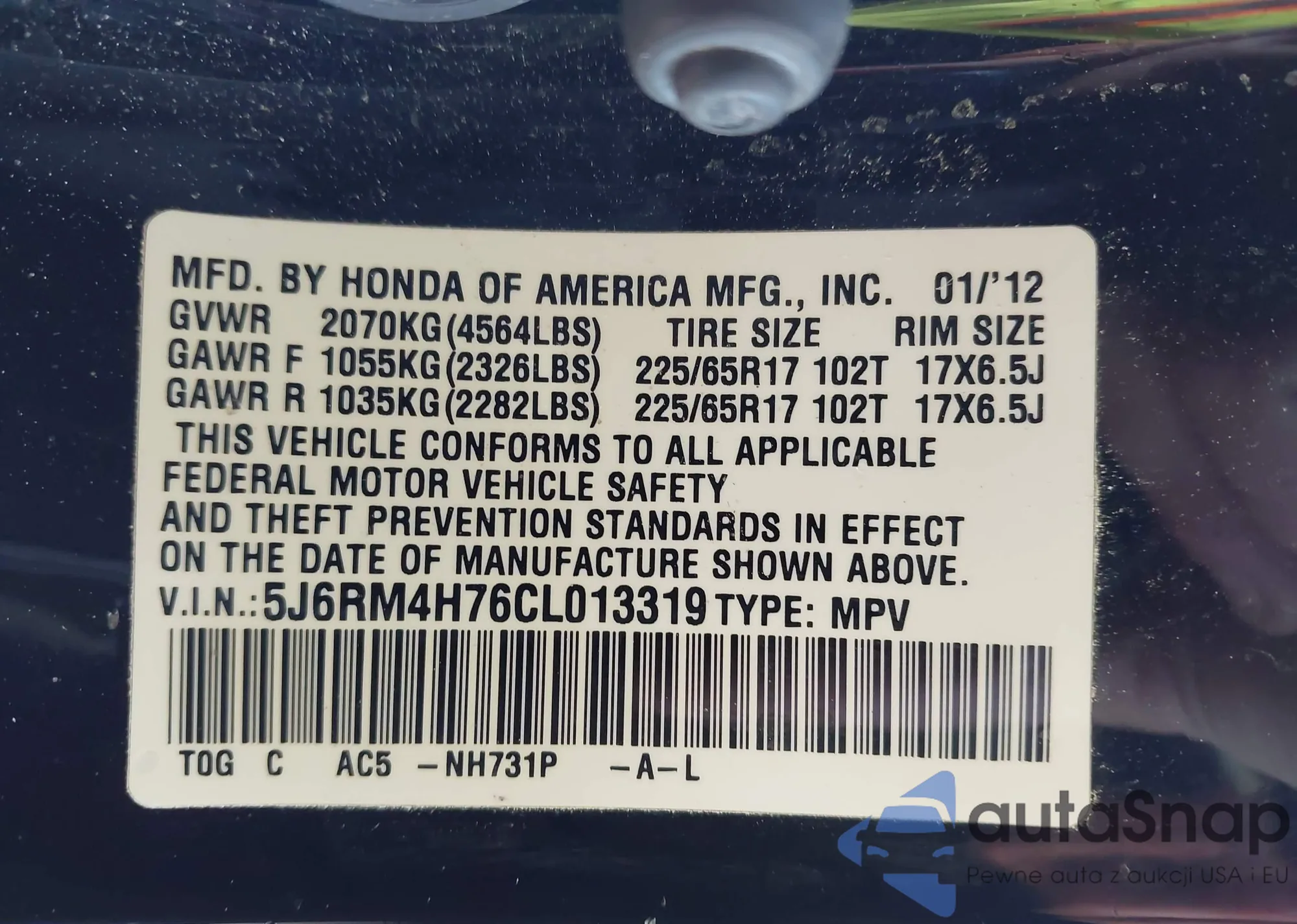 VIN: 5J6RM4H76CL013319