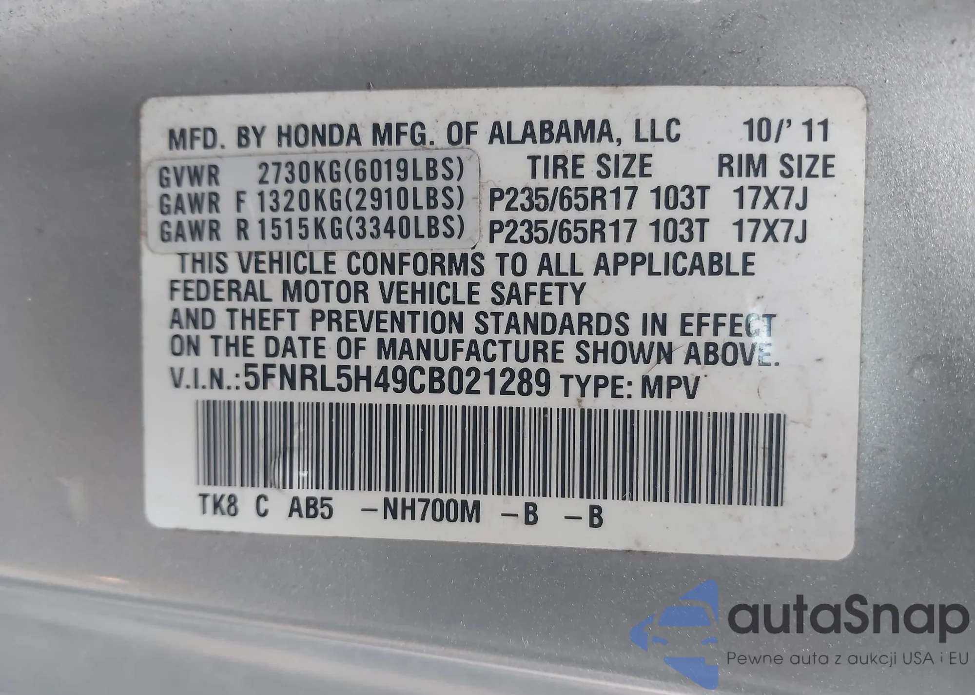Samochód Honda Odyssey 2012 (VIN 5FNRL5H49CB021289) nie był wcześniej licytowany. Dokumenty są czyste, przebieg odpowiada lub jest niższy niż średnia rynku. Sprzedaje go firma ubezpieczeniowa – polecamy zakup. Dostawa do portu zajmie ok. 6–8 tygodni.