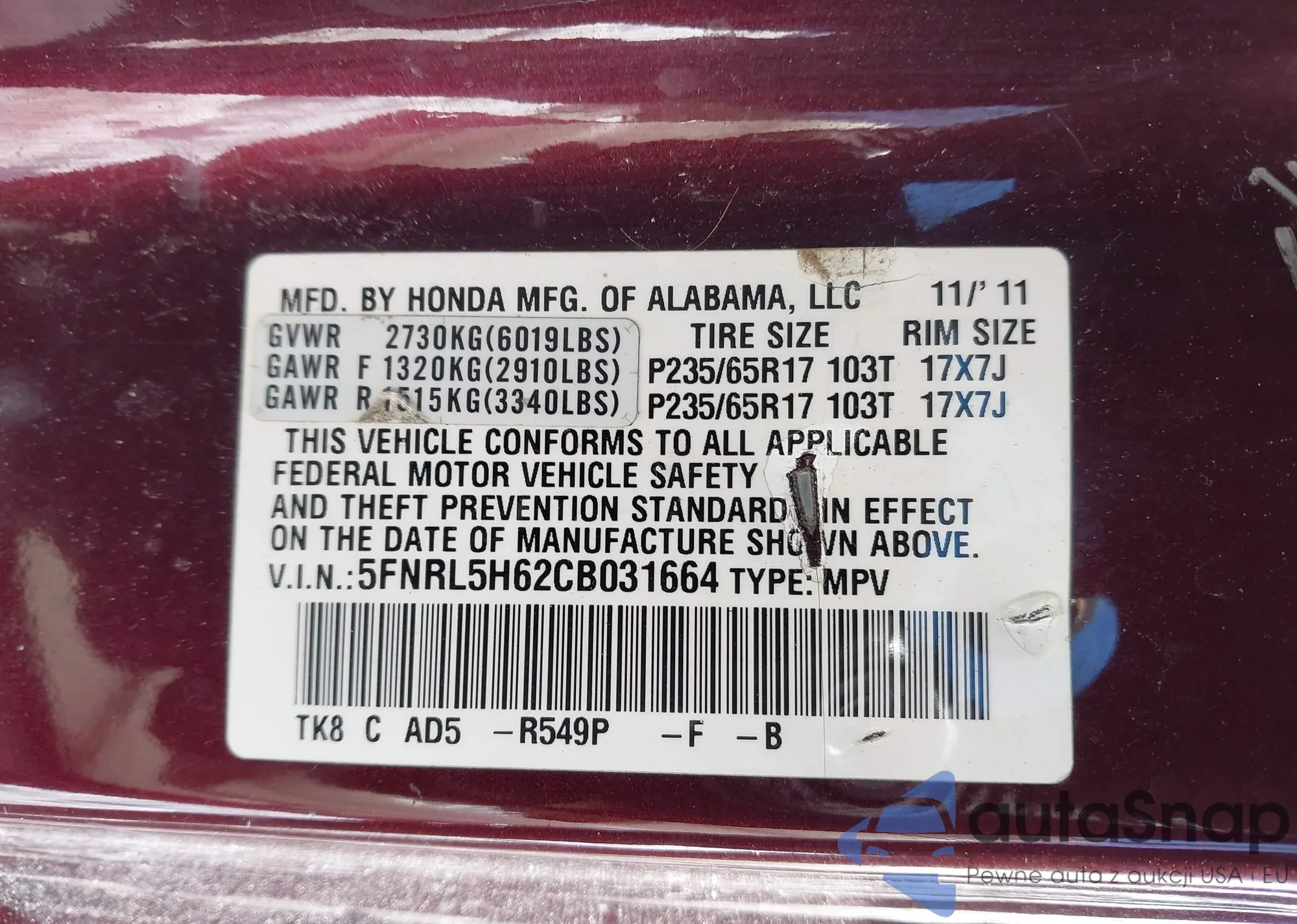 • VIN: 5FNRL5H62CB031664