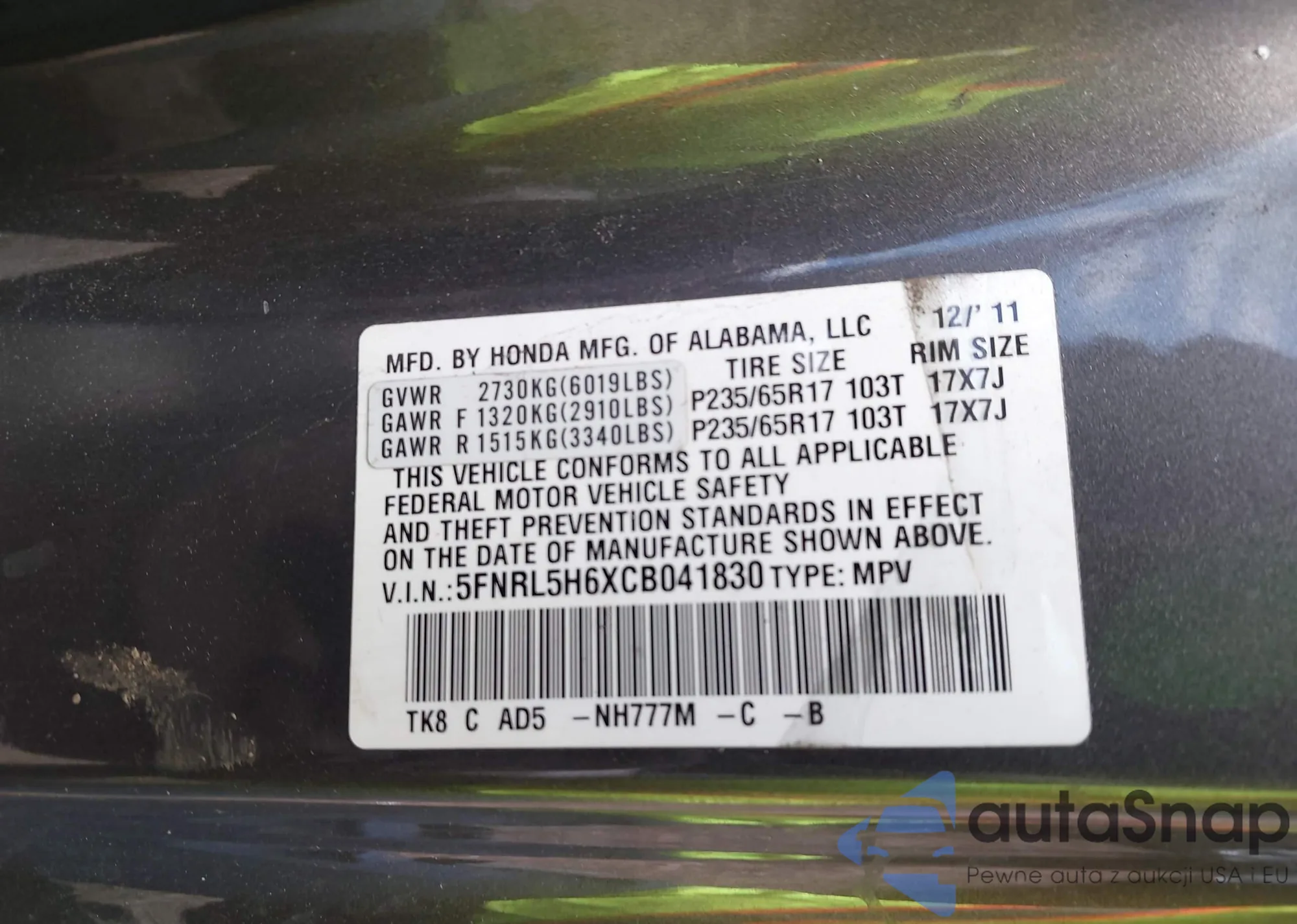• VIN: 5FNRL5H6XCB041830