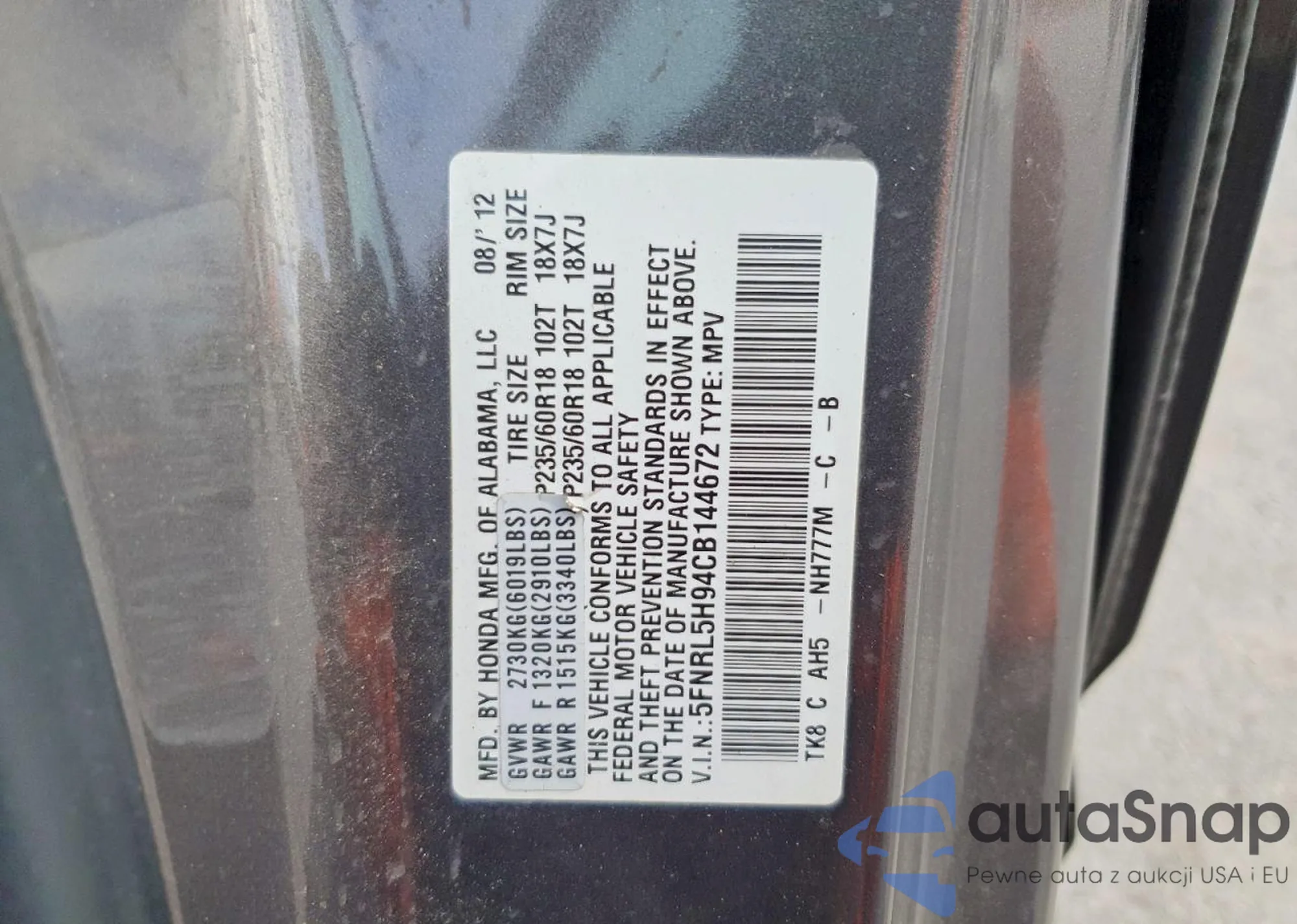 • VIN: 5FNRL5H94CB144672