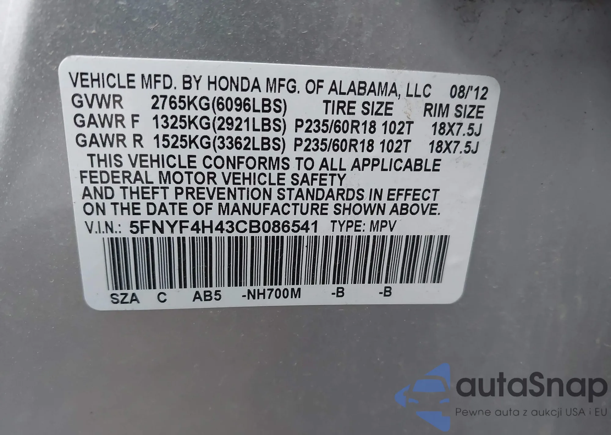 Samochód Honda Pilot 2012 (VIN 5FNYF4H43CB086541) nie był wcześniej licytowany. Dokumenty są czyste, przebieg odpowiada lub jest niższy niż średnia rynku. Sprzedaje go firma ubezpieczeniowa – polecamy zakup. Dostawa do portu zajmie ok. 6–8 tygodni.