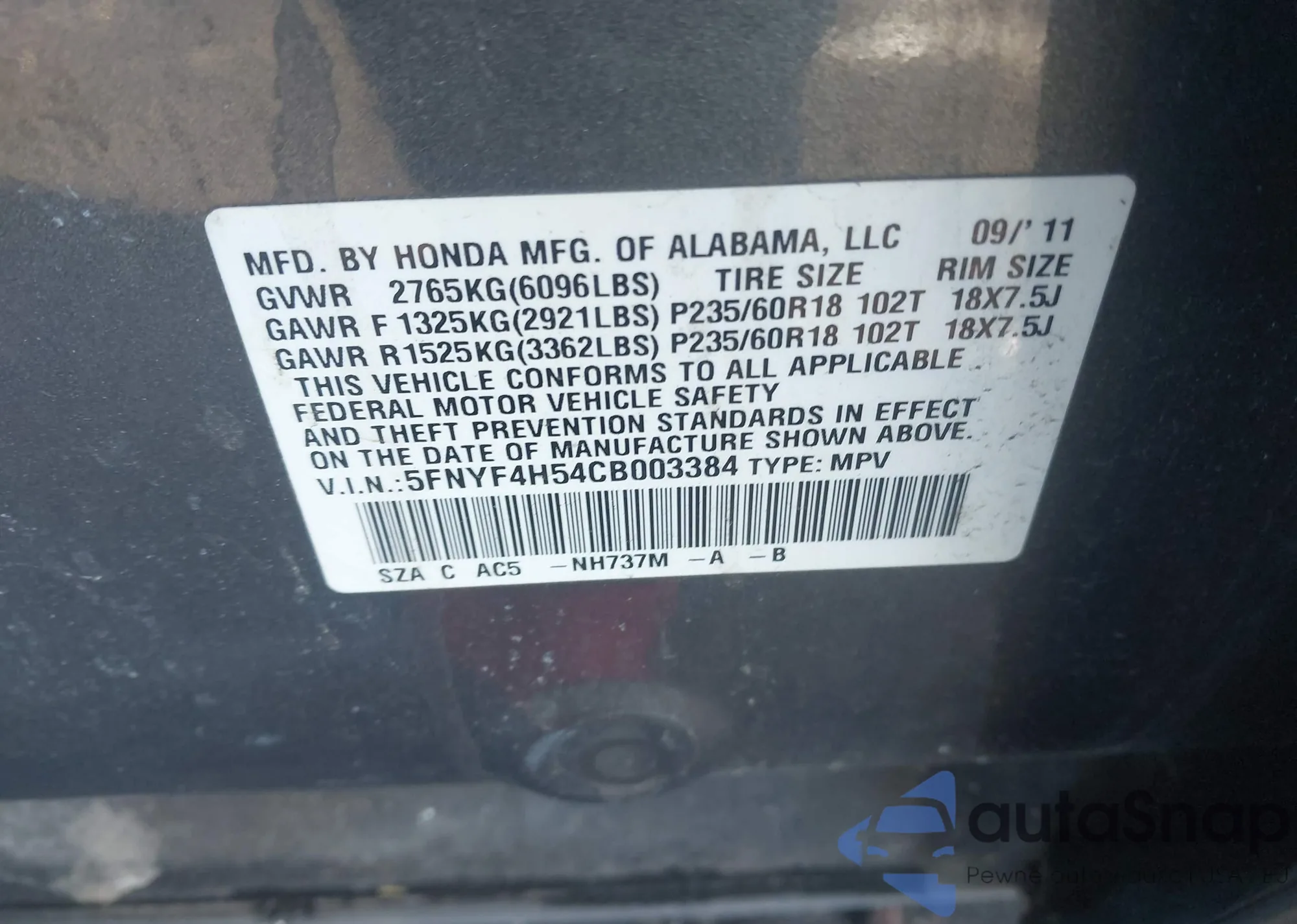 • VIN: 5FNYF4H54CB003384