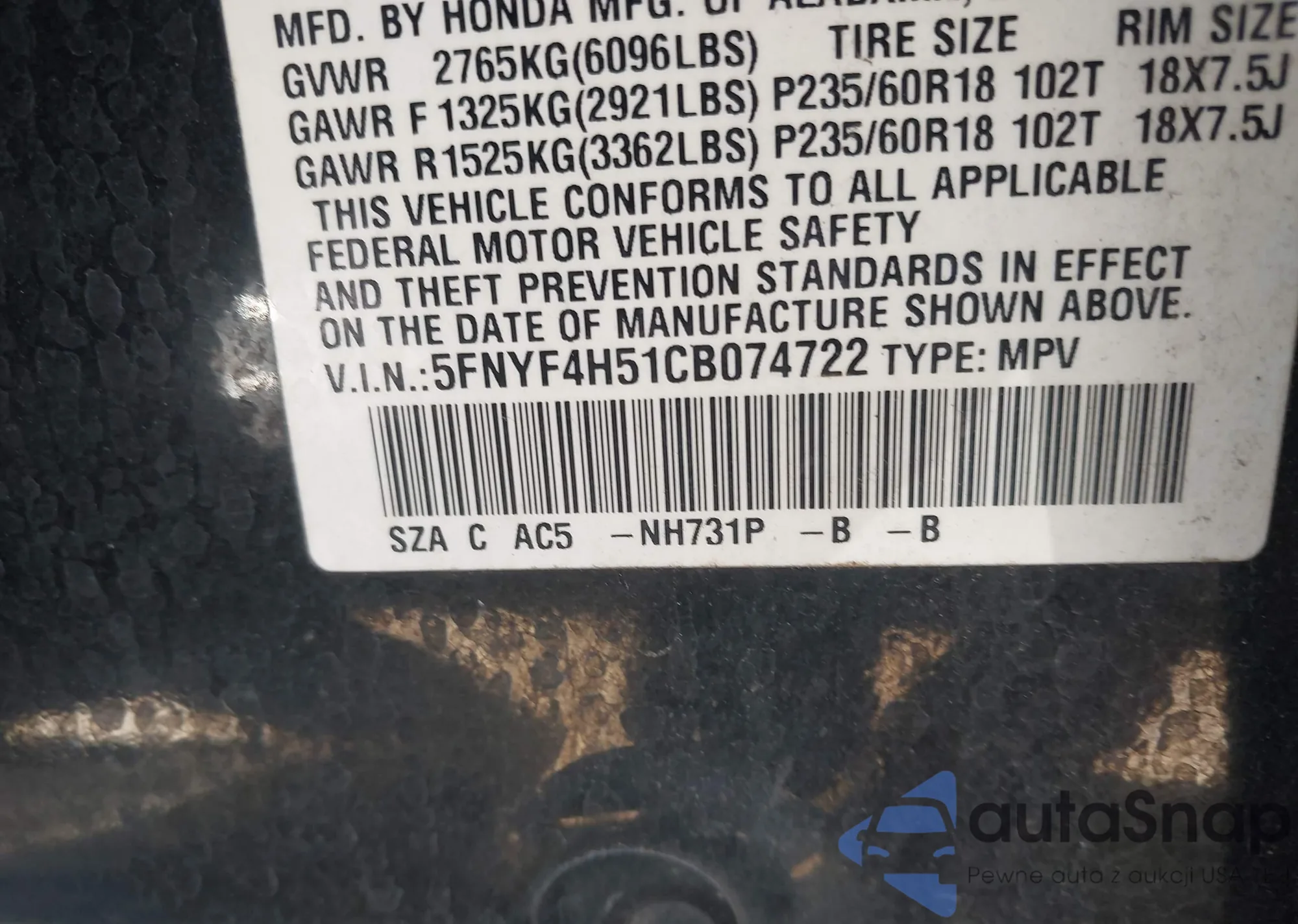 VIN: 5FNYF4H51CB074722