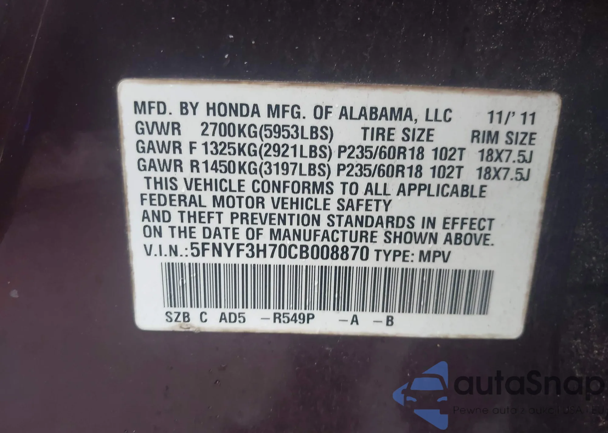 VIN: 5FNYF3H70CB008870