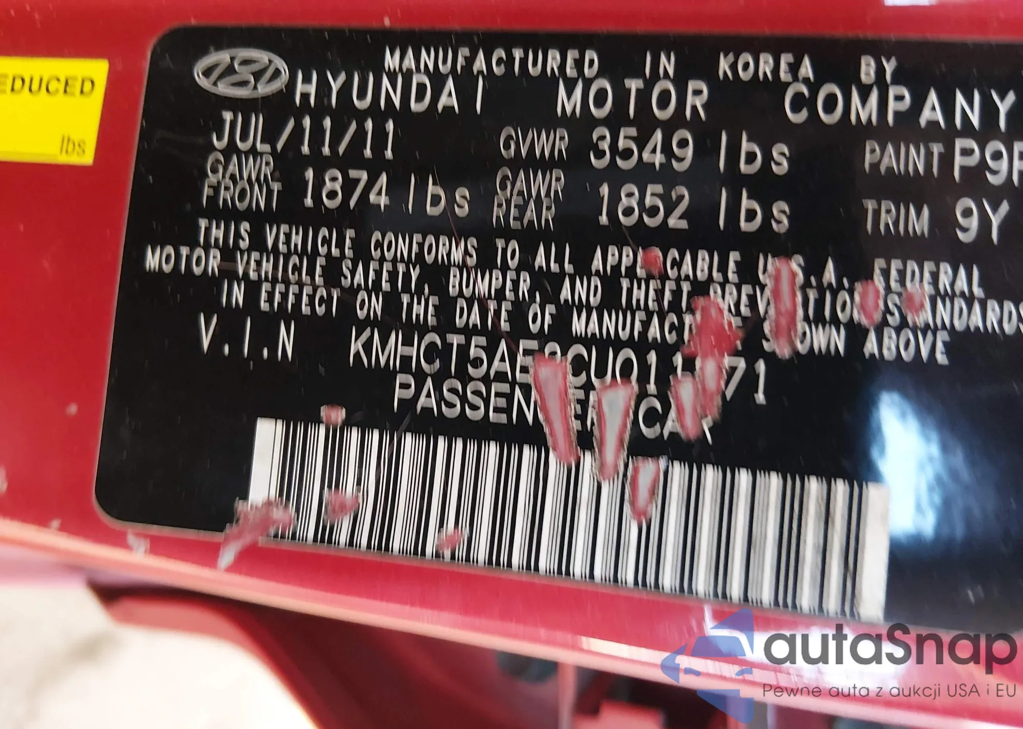 Samochód Hyundai Accent 2012 (VIN KMHCT5AE3CU011871) ma dokumenty uniemożliwiające rejestrację. Mogą pojawić się trudności przy eksporcie i rejestracji. Skontaktuj się z ekspertami AutaSnap w celu znalezienia alternatywy.
