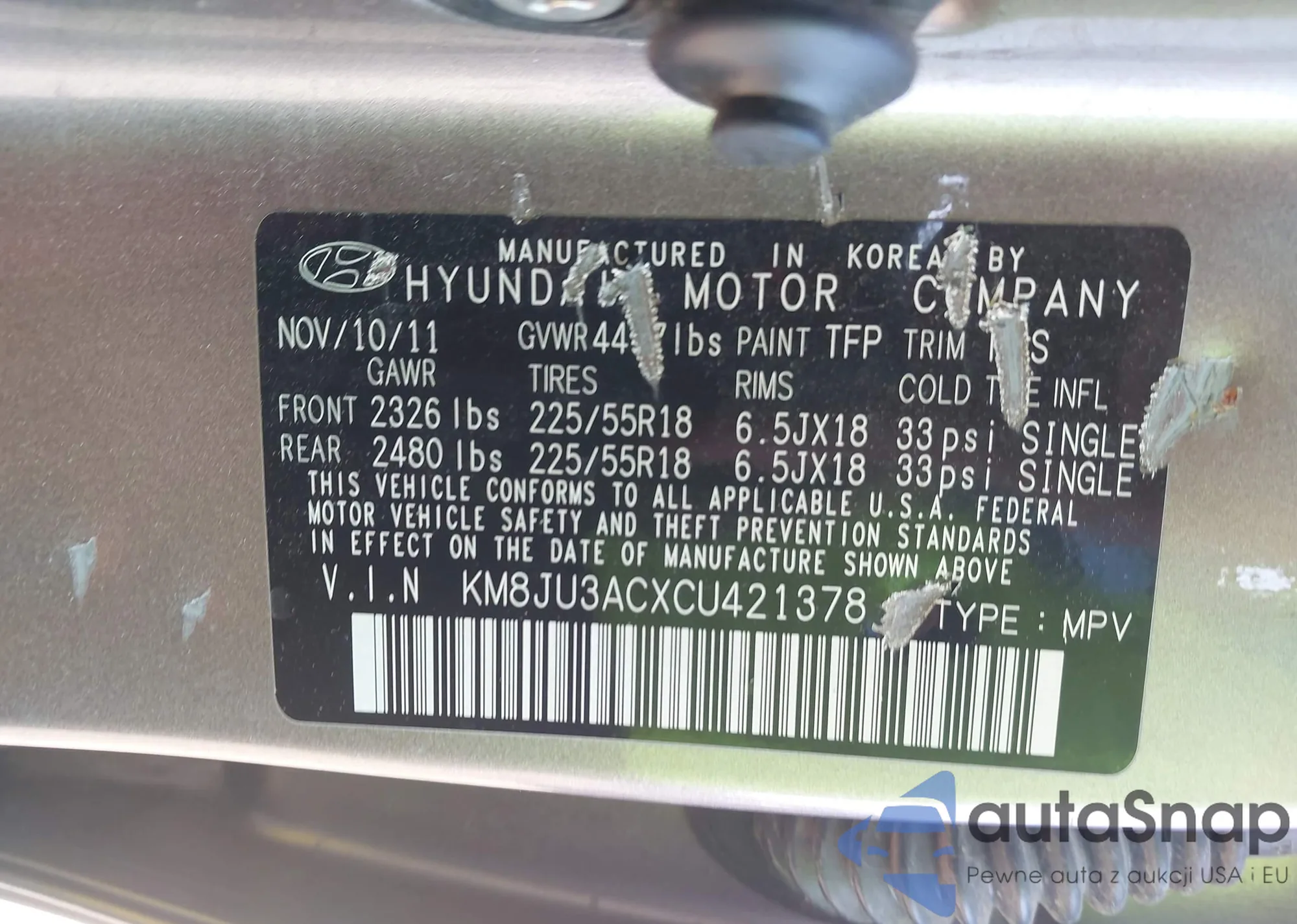 Samochód Hyundai Tucson 2012 (VIN KM8JU3ACXCU421378) nie był wcześniej licytowany. Dokumenty są czyste, przebieg odpowiada lub jest niższy niż średnia rynku. Sprzedaje go firma ubezpieczeniowa – polecamy zakup. Dostawa do portu zajmie ok. 6–8 tygodni.