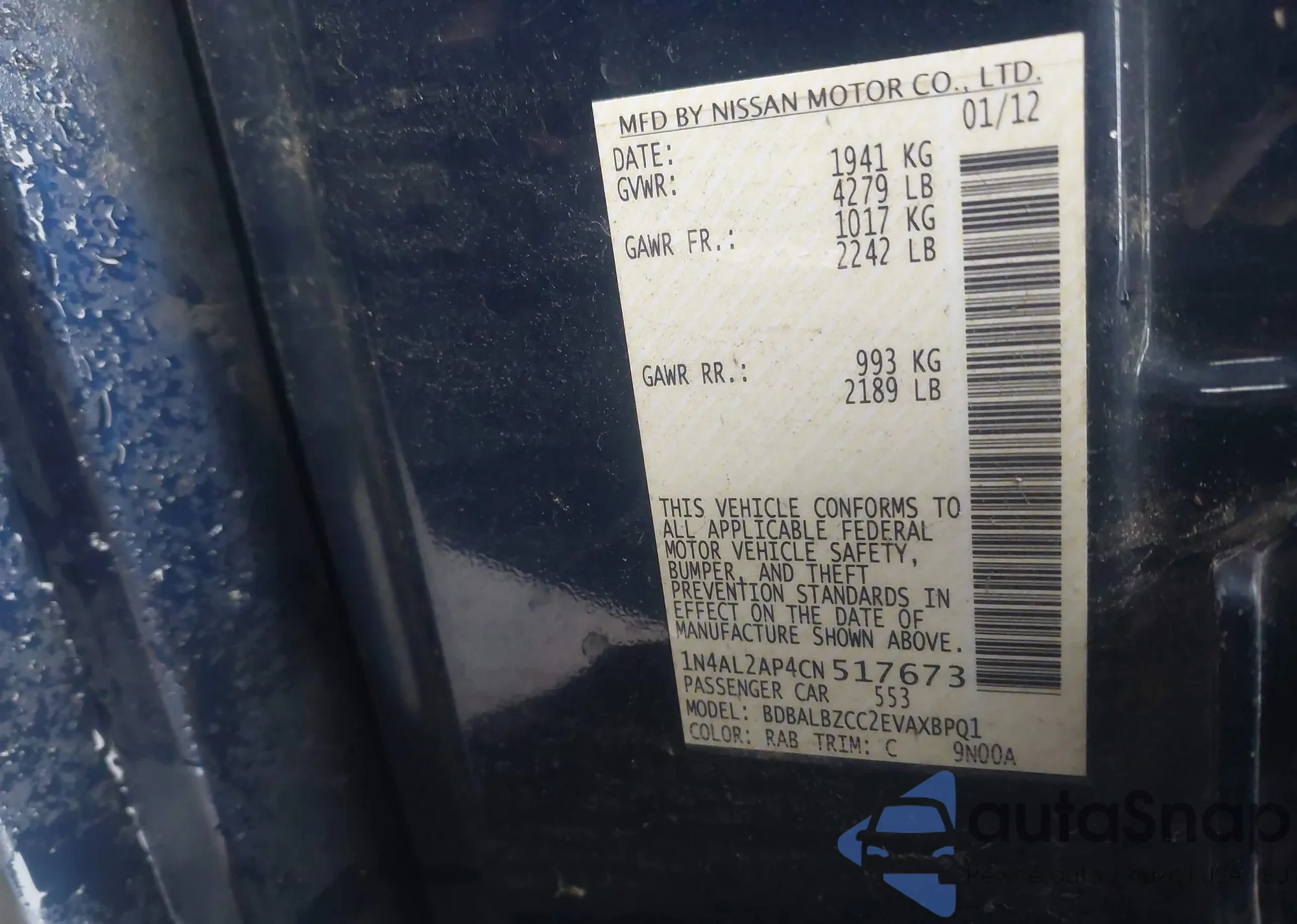 Samochód Nissan Altima 2012 (VIN 1N4AL2AP4CN517673) nie był wcześniej licytowany. Dokumenty są czyste, przebieg odpowiada lub jest niższy niż średnia rynku. Sprzedaje go firma ubezpieczeniowa – polecamy zakup. Dostawa do portu zajmie ok. 6–8 tygodni.
