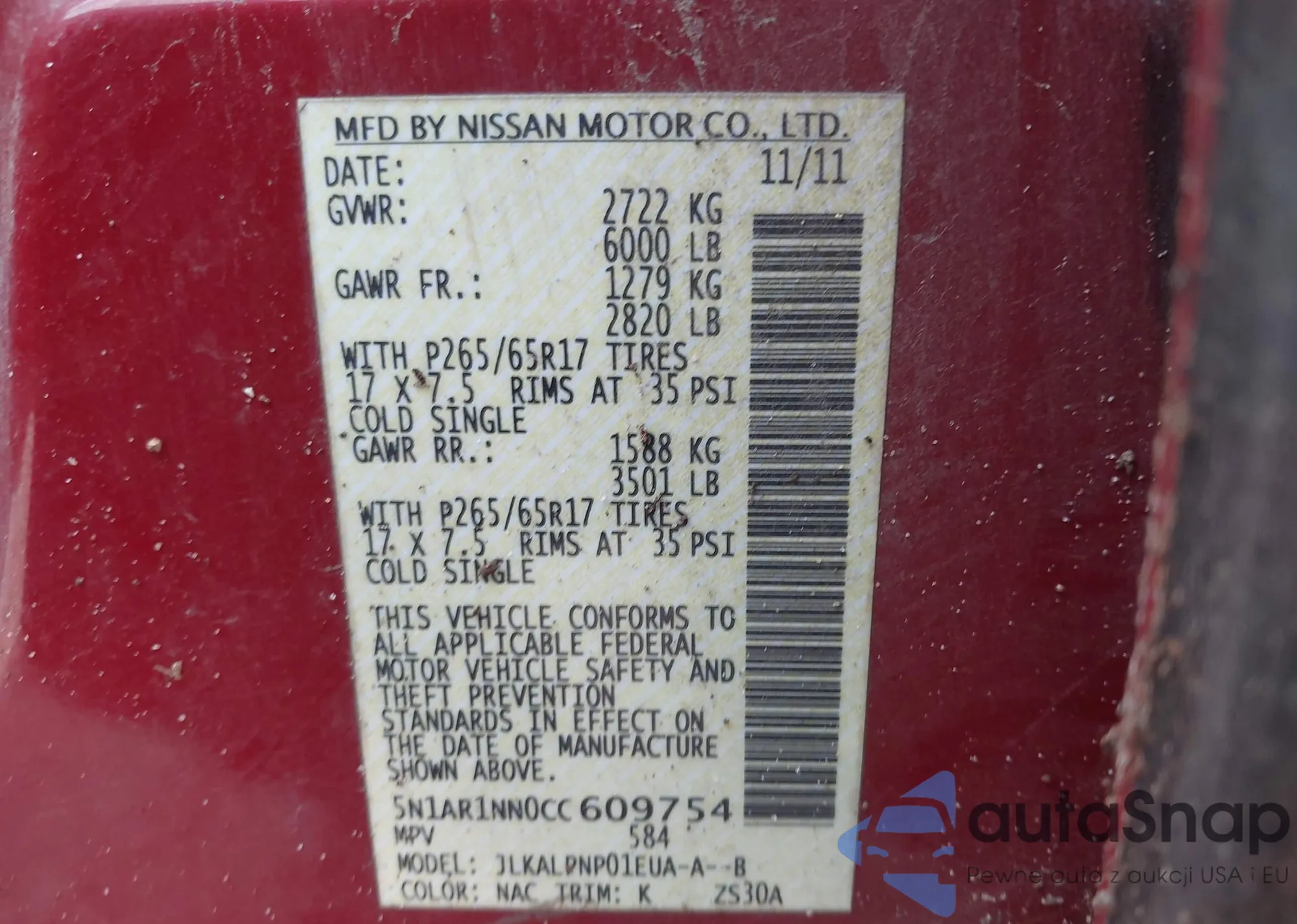 Samochód Nissan Pathfinder 2012 (VIN 5N1AR1NN0CC609754) nie był wcześniej licytowany. Dokumenty są czyste, przebieg odpowiada lub jest niższy niż średnia rynku. Sprzedaje go firma ubezpieczeniowa – polecamy zakup. Dostawa do portu zajmie ok. 6–8 tygodni.