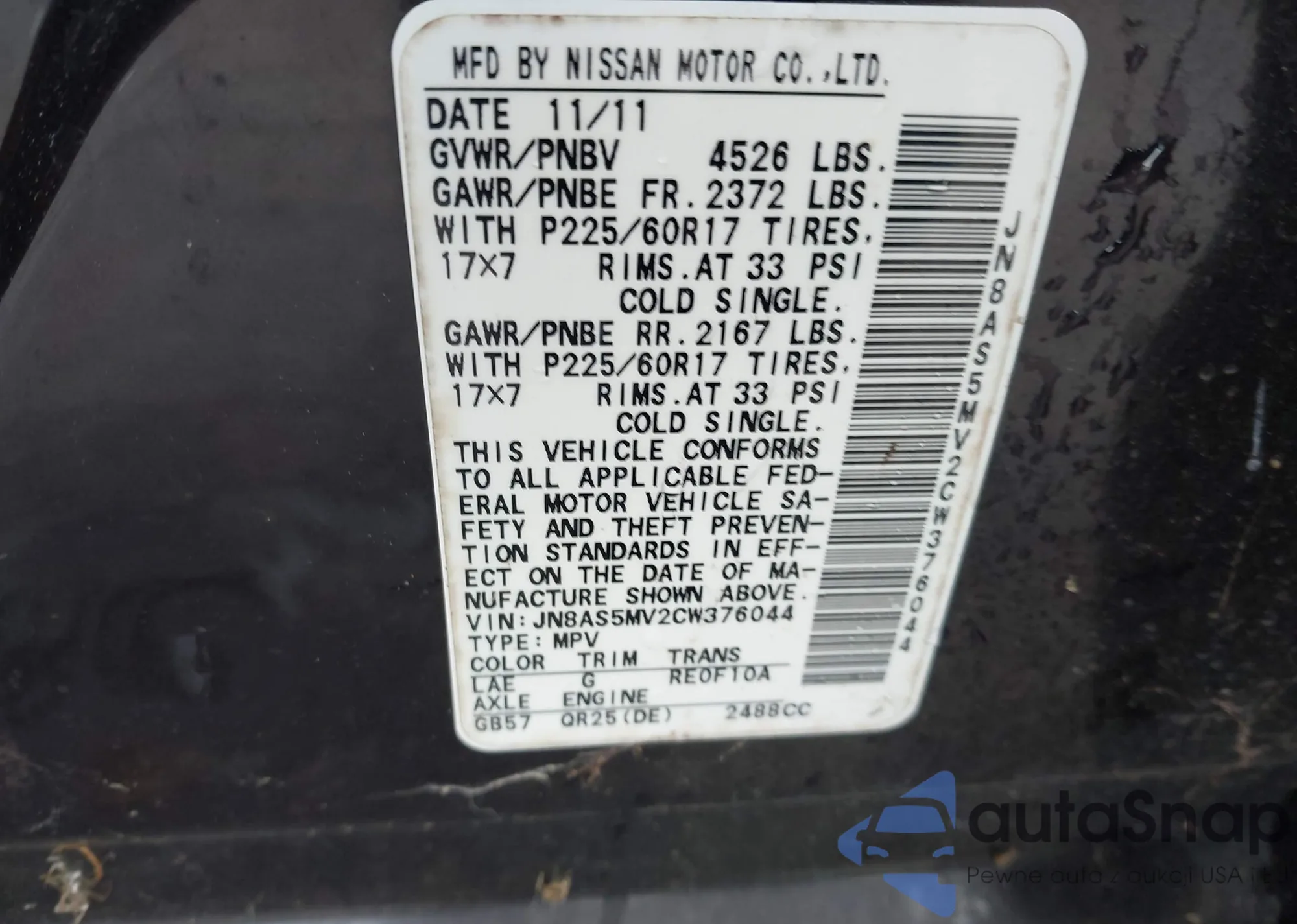 • VIN: JN8AS5MV2CW376044