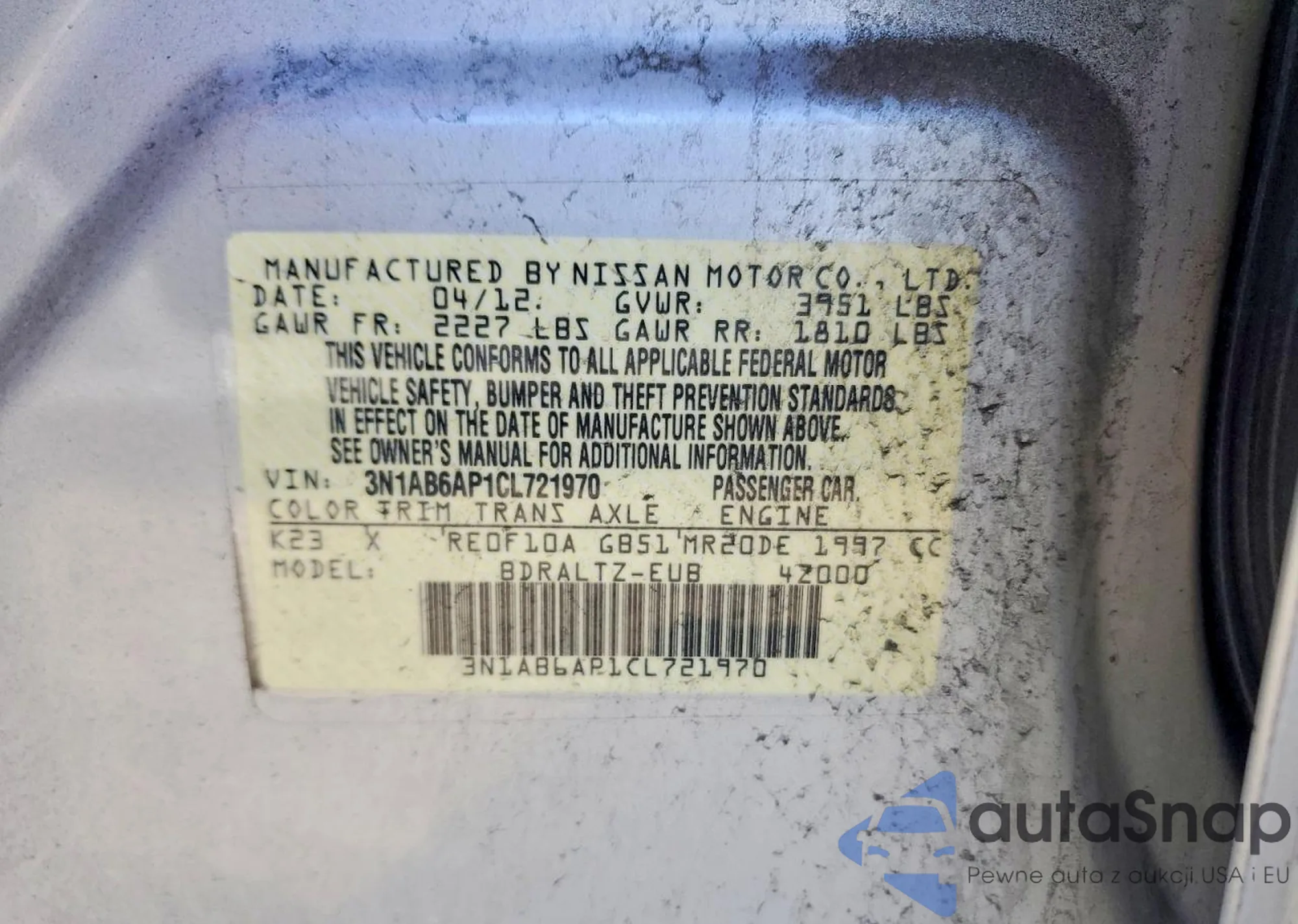 Samochód Nissan Sentra 2012 (VIN 3N1AB6AP1CL721970) nie był wcześniej licytowany. Dokumenty są czyste, przebieg odpowiada lub jest niższy niż średnia rynku. Sprzedaje go firma ubezpieczeniowa – polecamy zakup. Dostawa do portu zajmie ok. 6–8 tygodni.