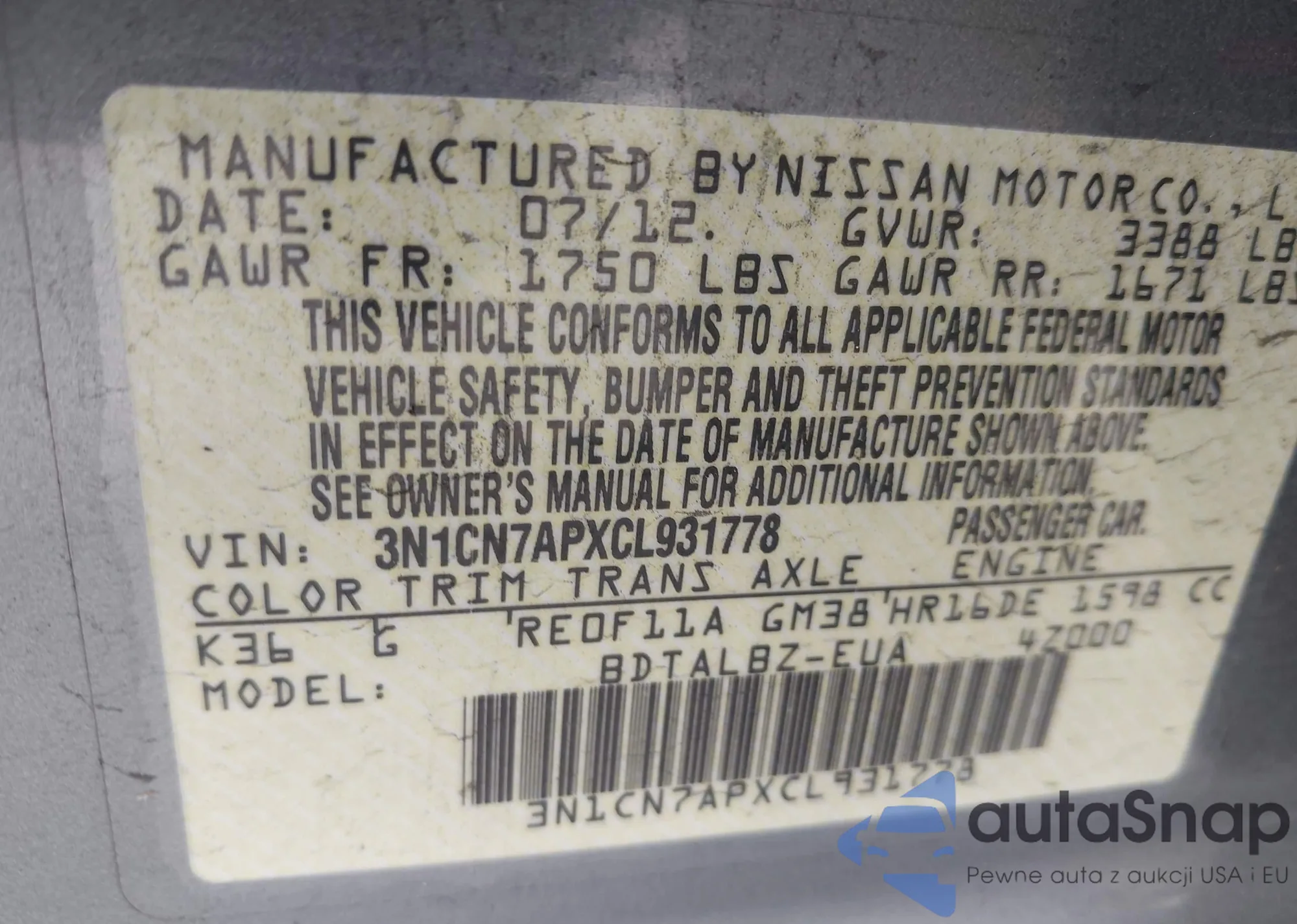 • VIN: 3N1CN7APXCL931778