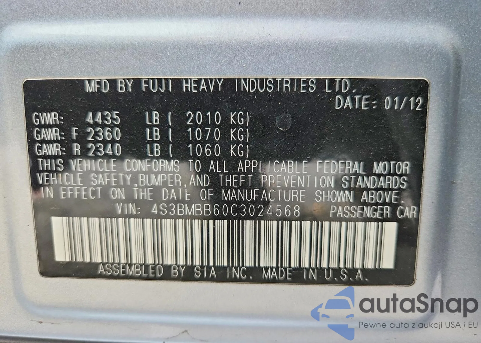 Samochód Subaru Legacy 2012 (VIN 4S3BMBB60C3024568) sprzedaje go niezweryfikowany sprzedawca. Zalecamy raport Carfax i potwierdzenie możliwości rejestracji pojazdu przed zakupem.