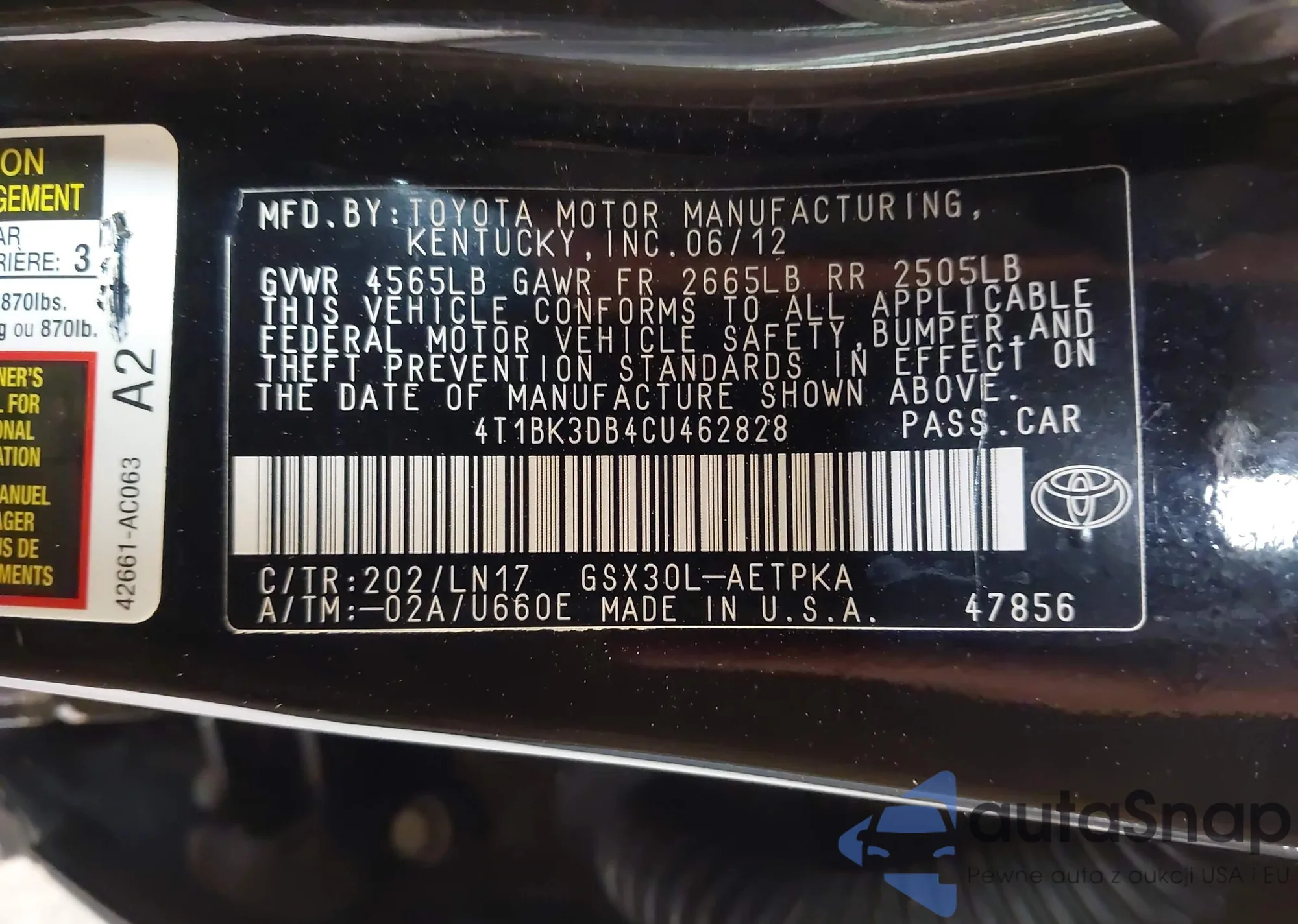 Samochód Toyota Avalon 2012 (VIN 4T1BK3DB4CU462828) nie był wcześniej licytowany. Dokumenty są czyste, przebieg odpowiada lub jest niższy niż średnia rynku. Sprzedaje go firma ubezpieczeniowa – polecamy zakup. Dostawa do portu zajmie ok. 6–8 tygodni.