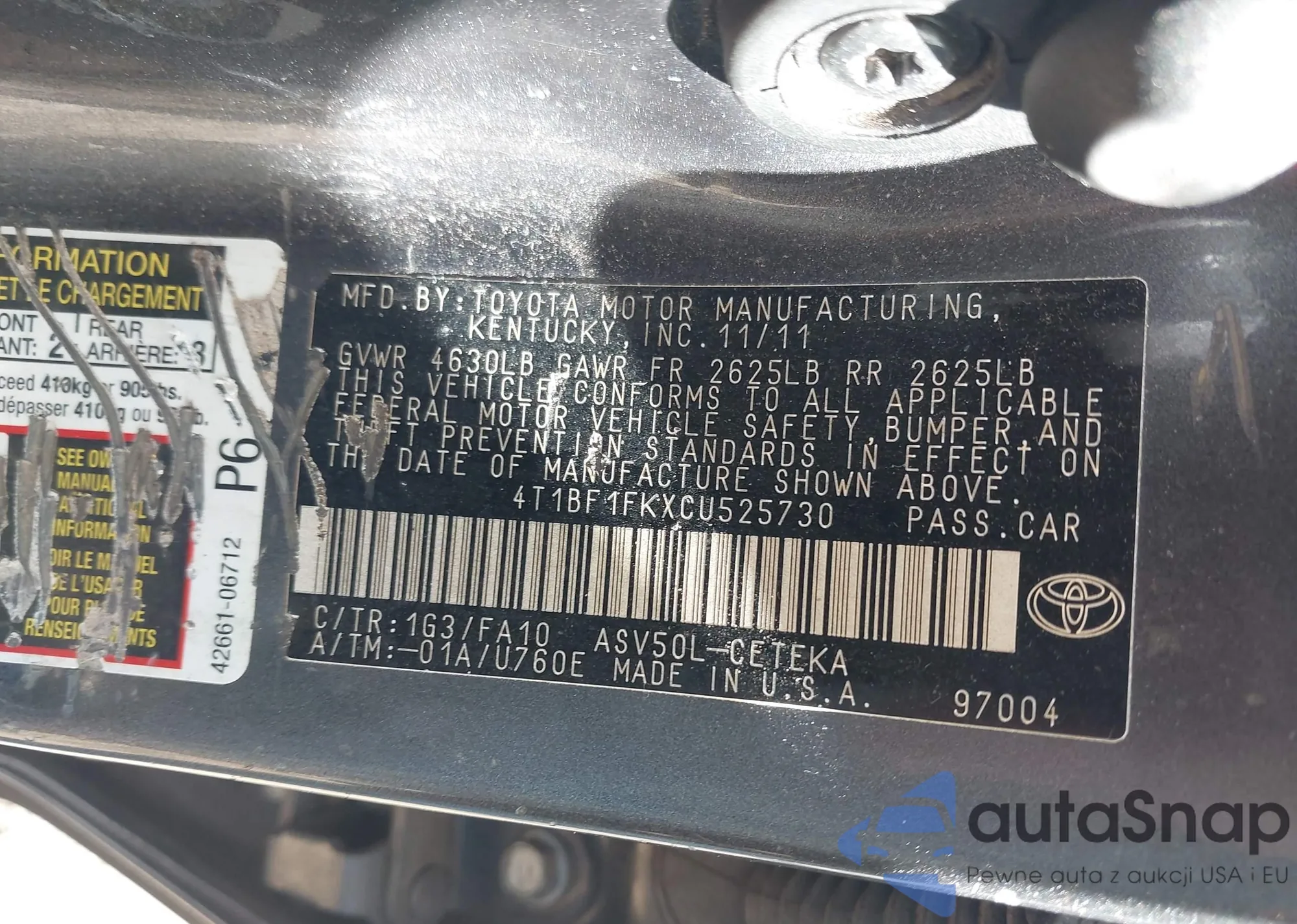 Samochód Toyota Camry 2012 (VIN 4T1BF1FKXCU525730) nie był wcześniej licytowany. Dokumenty są czyste, przebieg odpowiada lub jest niższy niż średnia rynku. Sprzedaje go firma ubezpieczeniowa – polecamy zakup. Dostawa do portu zajmie ok. 6–8 tygodni.