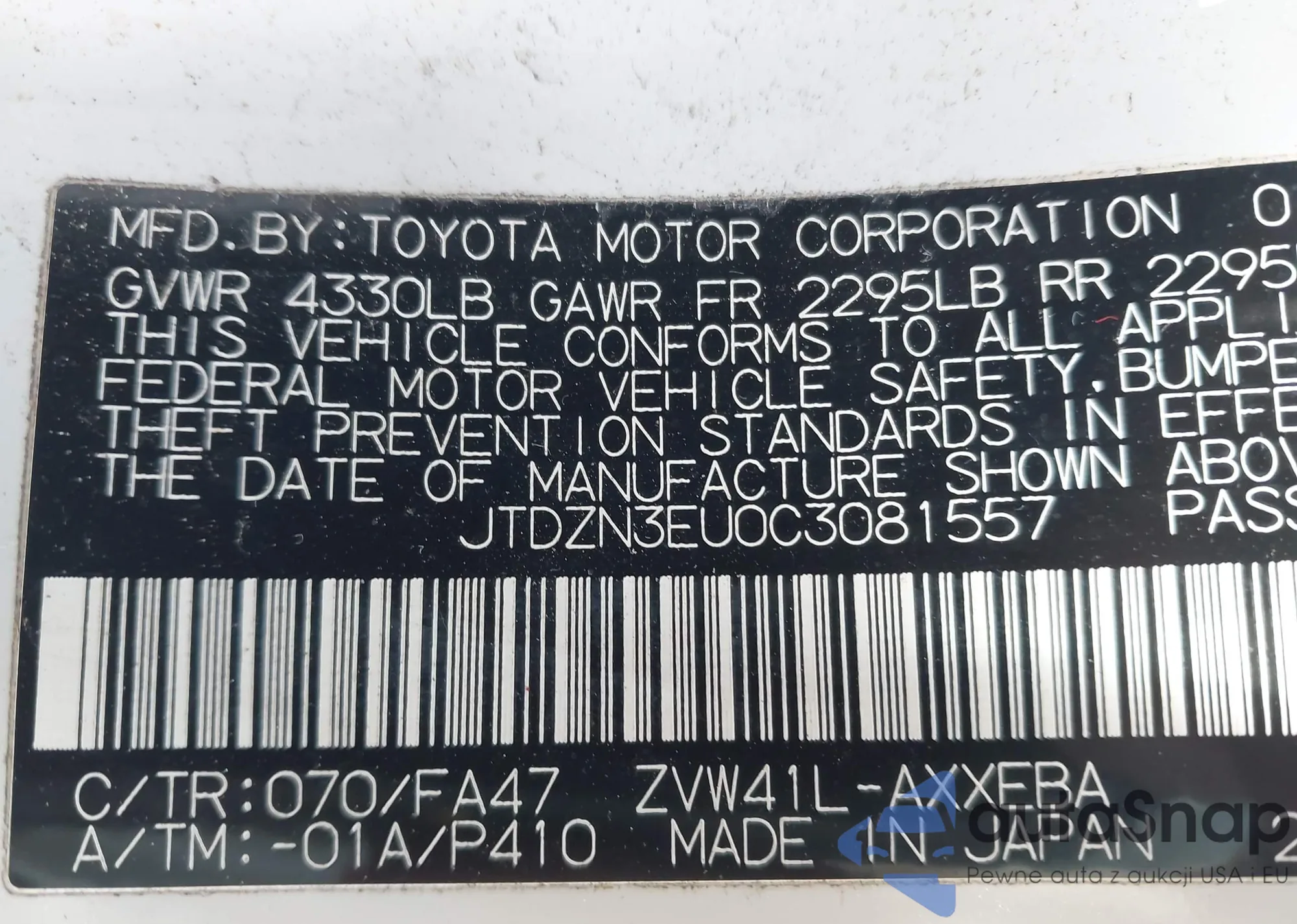 • VIN: JTDZN3EU0C3081557