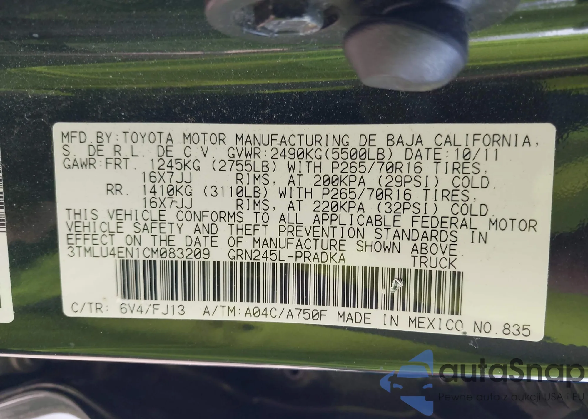 Samochód Toyota Tacoma 2012 (VIN 3TMLU4EN1CM083209) nie był wcześniej licytowany. Dokumenty są czyste, przebieg odpowiada lub jest niższy niż średnia rynku. Sprzedaje go firma ubezpieczeniowa – polecamy zakup. Dostawa do portu zajmie ok. 6–8 tygodni.