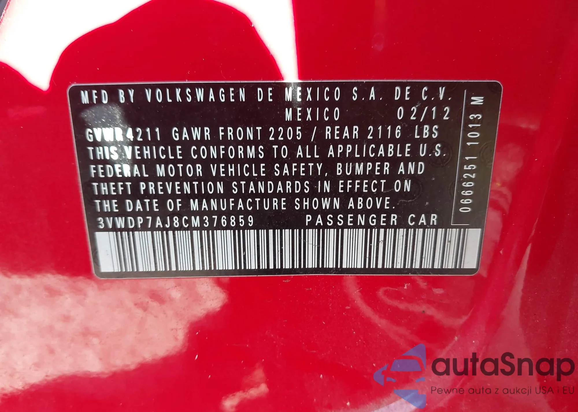 VIN: 3VWDP7AJ8CM376859