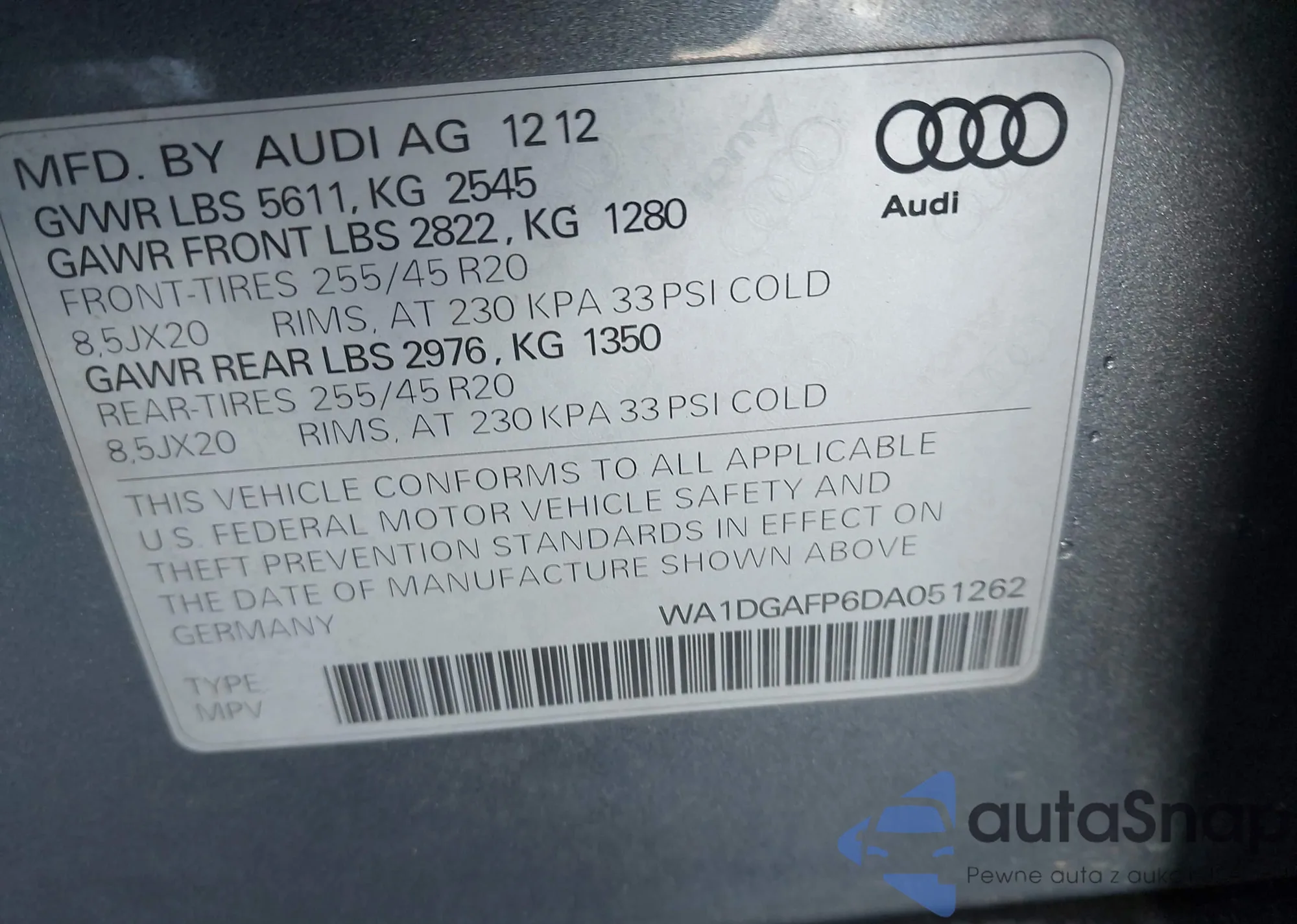 Samochód Audi Q5 2013 (VIN WA1DGAFP6DA051262) sprzedaje go niezweryfikowany sprzedawca. Zalecamy raport Carfax i potwierdzenie możliwości rejestracji pojazdu przed zakupem.