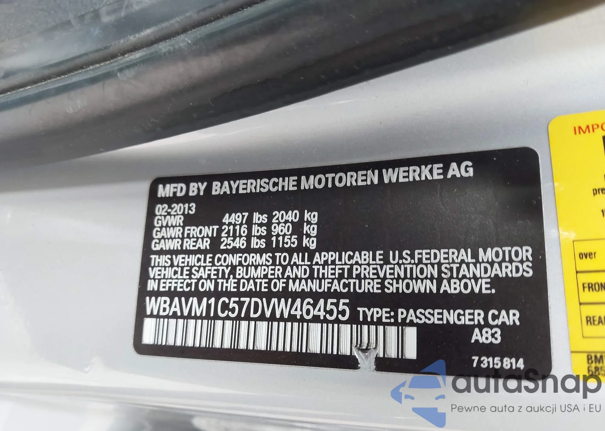 • VIN: WBAVM1C57DVW46455