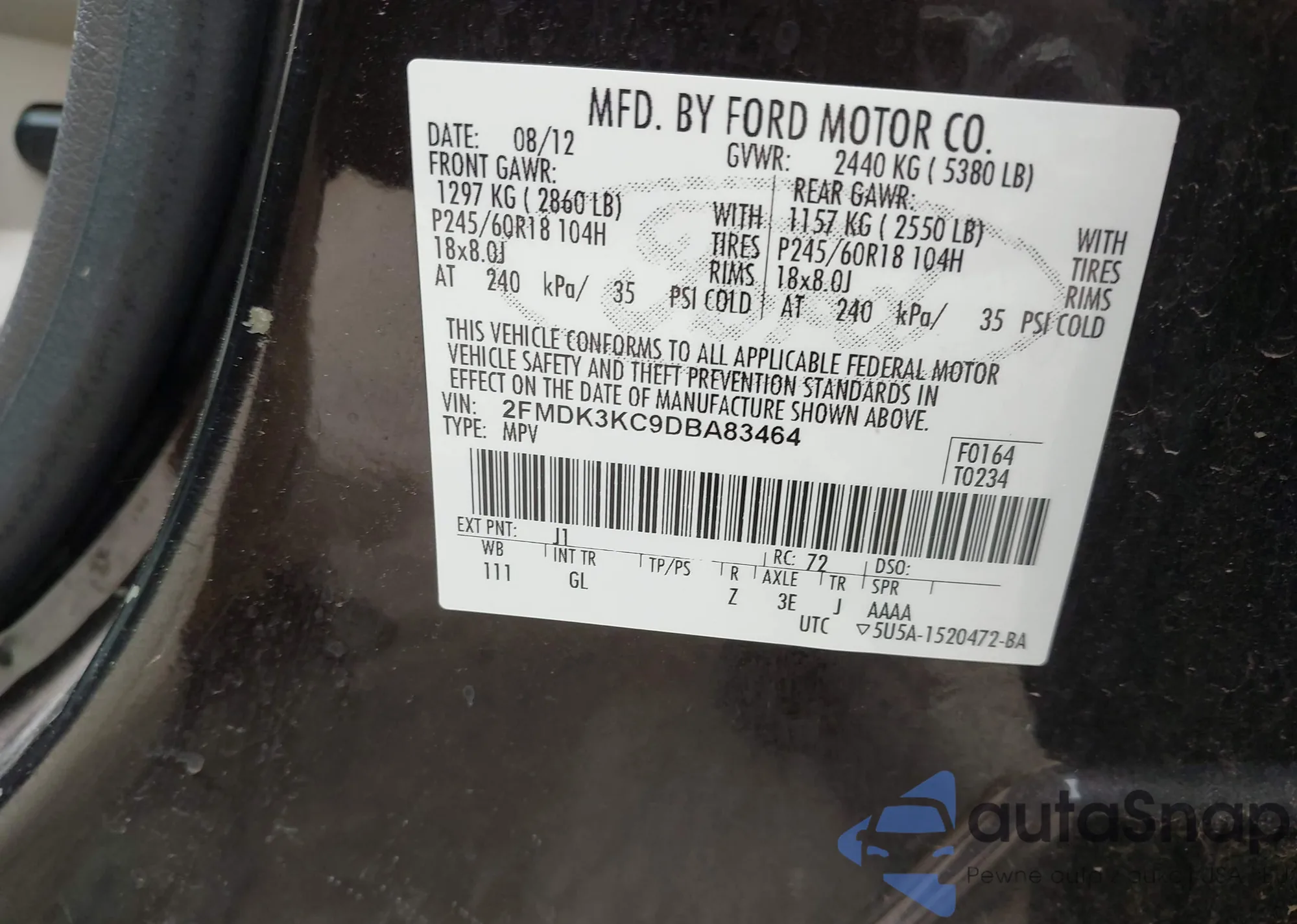 • VIN: 2FMDK3KC9DBA83464