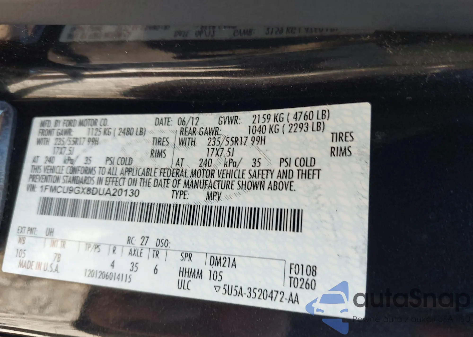 VIN: 1FMCU9GX8DUA20130