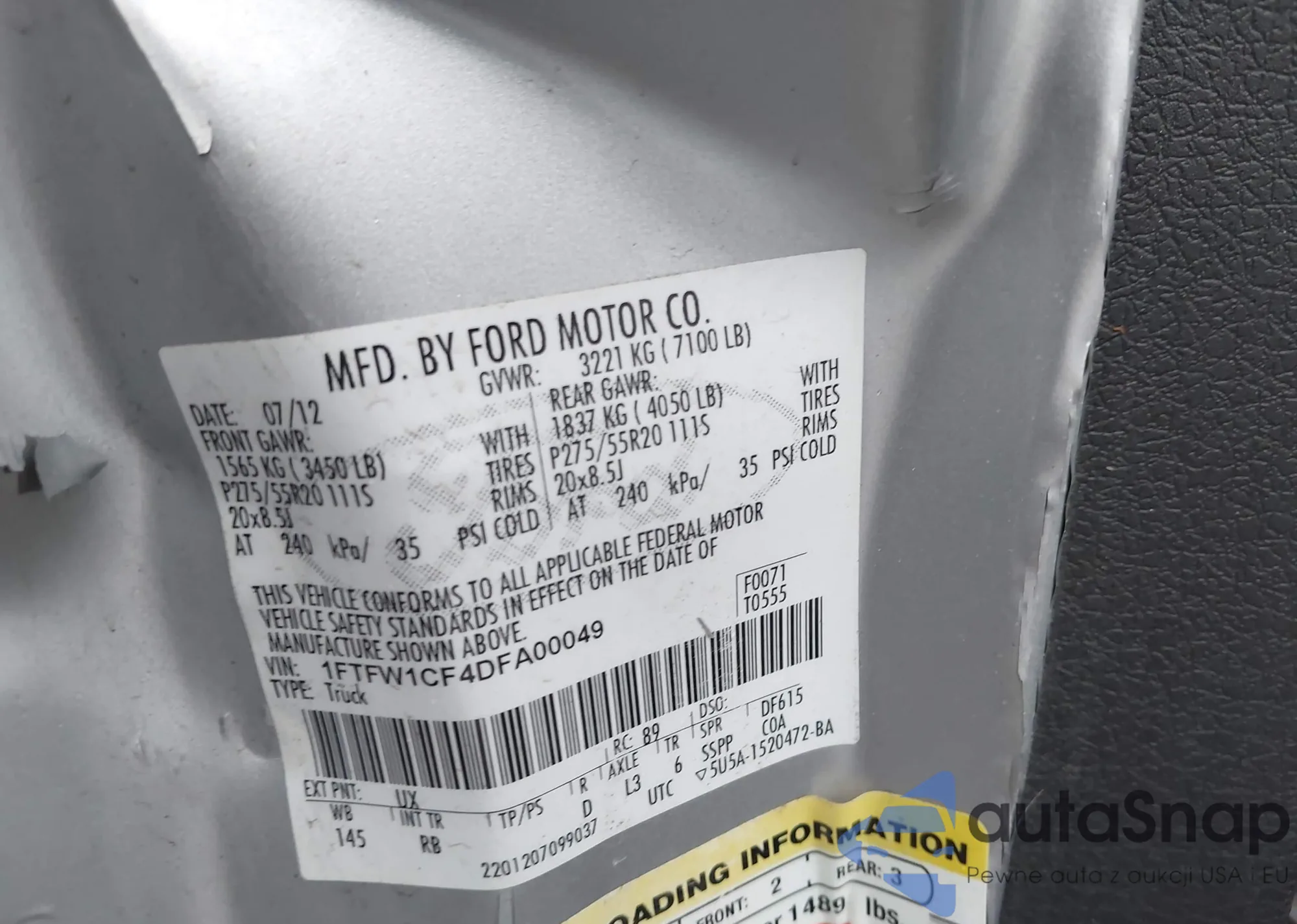 Samochód Ford F-150 2013 (VIN 1FTFW1CF4DFA00049) nie był wcześniej licytowany. Dokumenty są czyste, przebieg odpowiada lub jest niższy niż średnia rynku. Sprzedaje go firma ubezpieczeniowa – polecamy zakup. Dostawa do portu zajmie ok. 6–8 tygodni.