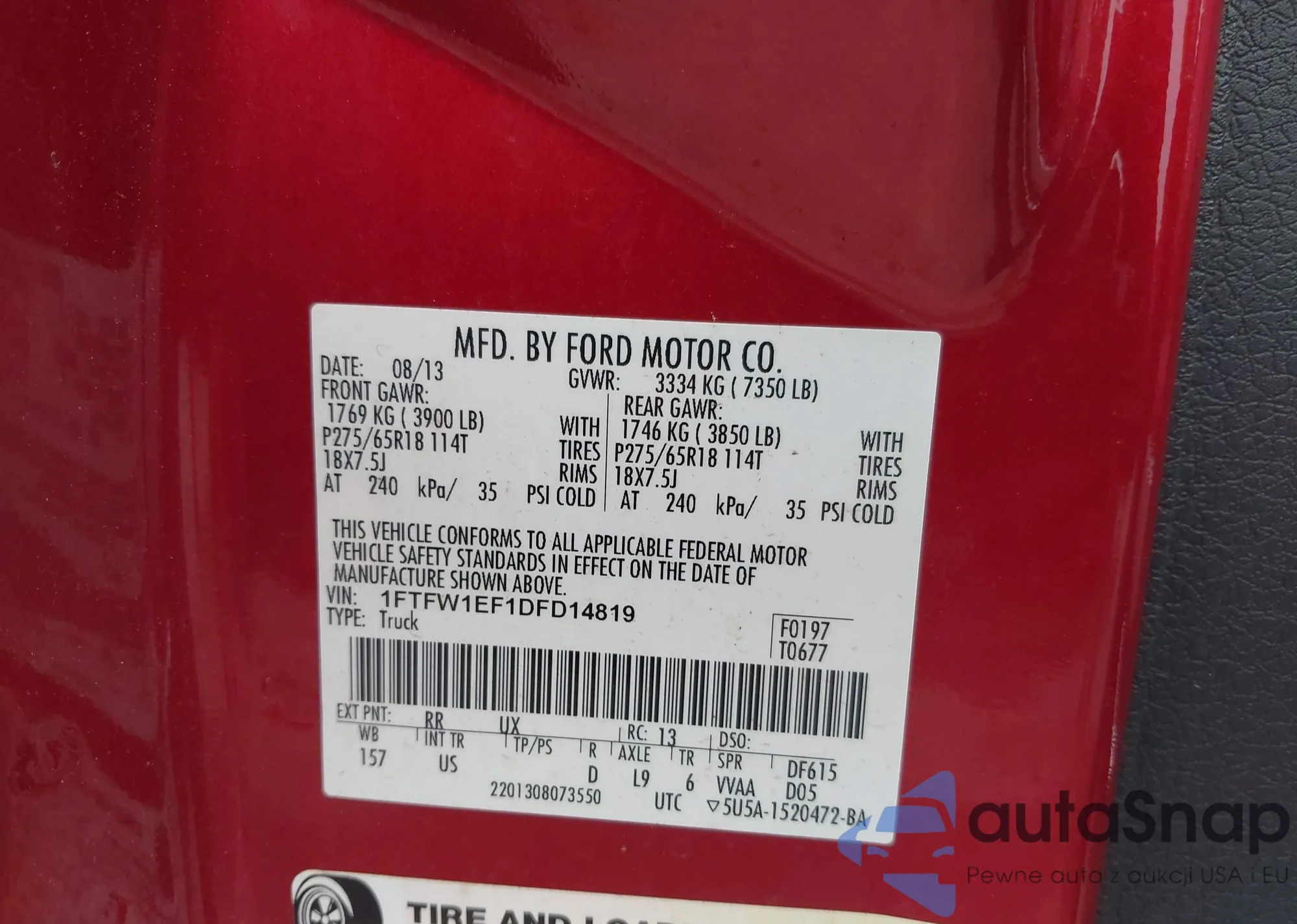 Samochód Ford F-150 2013 (VIN 1FTFW1EF1DFD14819) nie był wcześniej licytowany. Dokumenty są czyste, przebieg odpowiada lub jest niższy niż średnia rynku. Sprzedaje go firma ubezpieczeniowa – polecamy zakup. Dostawa do portu zajmie ok. 6–8 tygodni.