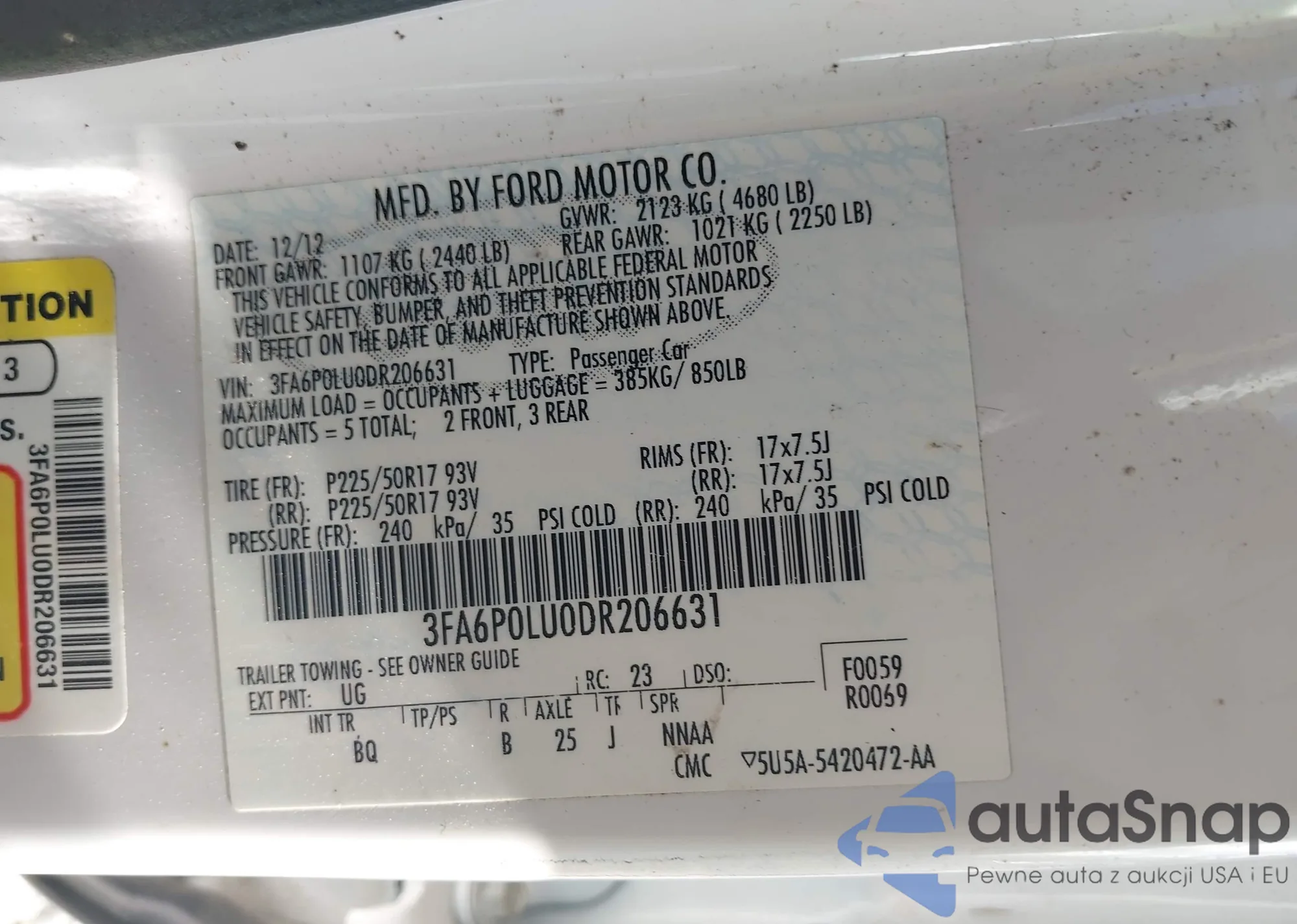Samochód Ford Fusion 2013 (VIN 3FA6P0LU0DR206631) nie był wcześniej licytowany. Dokumenty są czyste, przebieg odpowiada lub jest niższy niż średnia rynku. Sprzedaje go firma ubezpieczeniowa – polecamy zakup. Dostawa do portu zajmie ok. 6–8 tygodni.